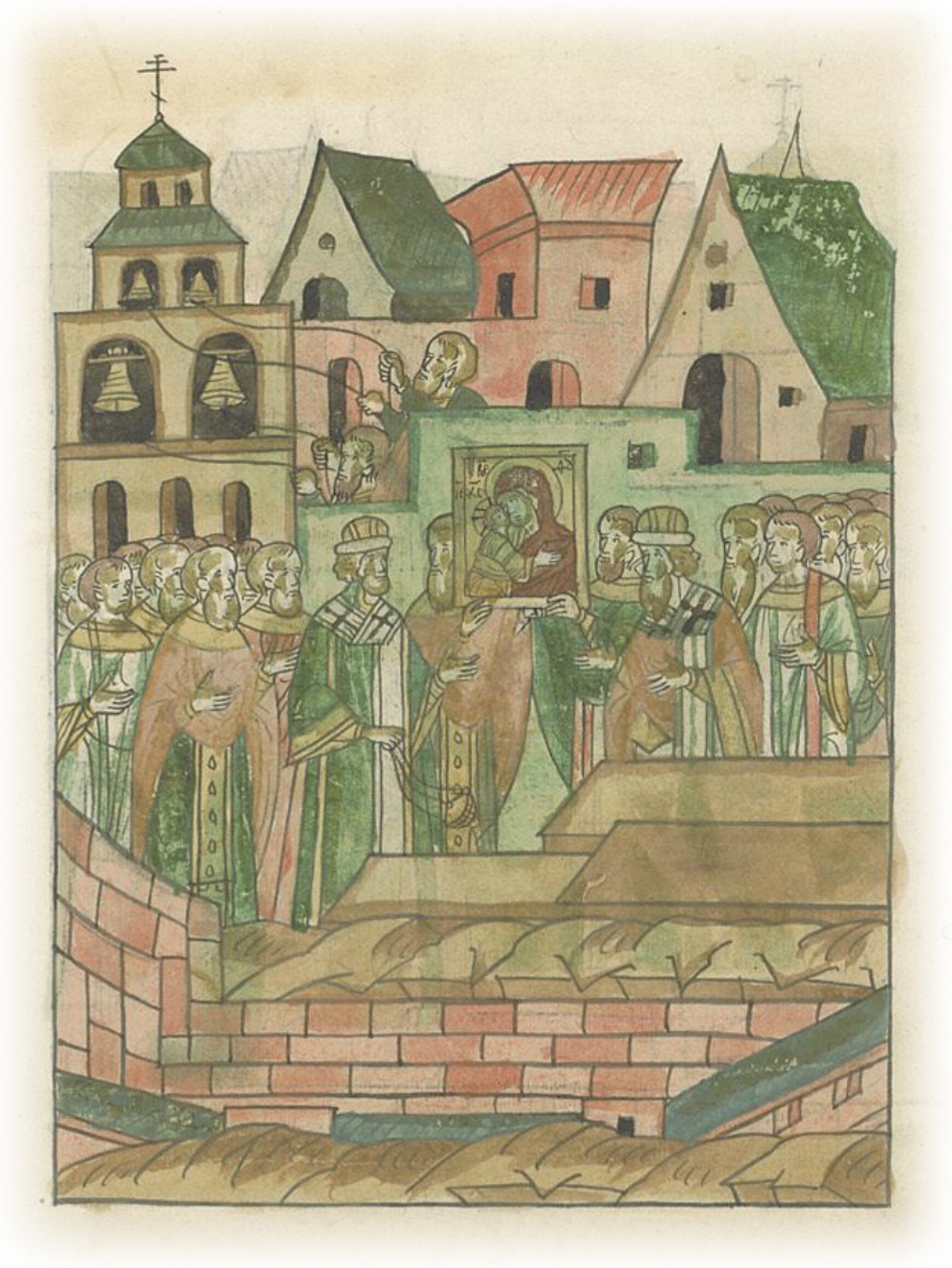 Создание соборной церкви Успения пресвятой Богородицы в Москве митрополитом всея Руси Филиппом. Митрополит собирает весь освященный собор и начинает петь надгробные песнопения у гробов преосвященных митрополитов.