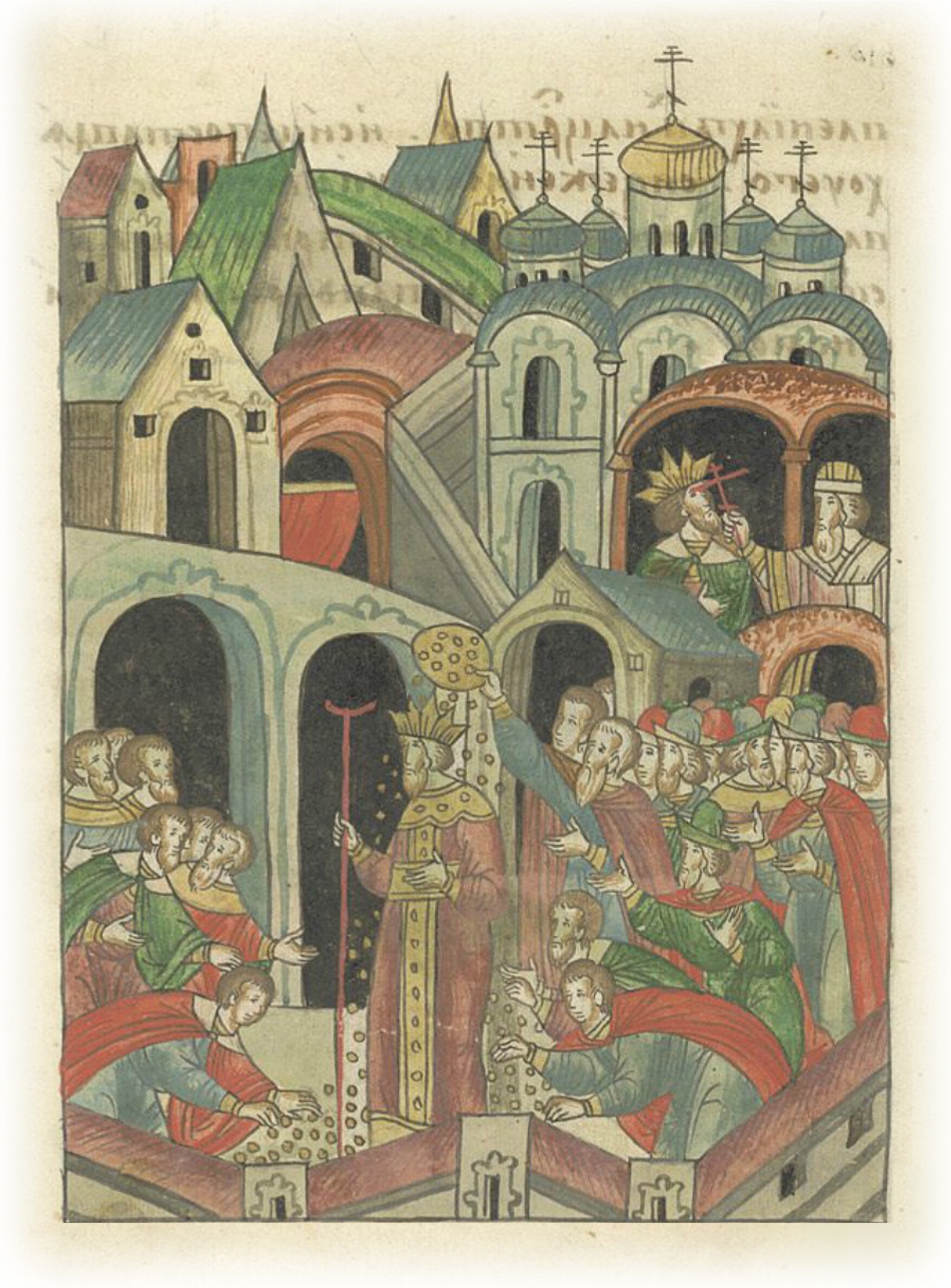 И после сего благословился царь у патриарха с великою тихостью и смирением, и со страхом Божьим; и вышел из церкви очень благочинно, словно некий великий священноначальник; и осыпали его ставратами*. Народ же похватал их каждый своими руками. Таковыми по древнему преданию царям были поставления их на царство, и так и поставляли его; так же и Мануил царь поставлен был Антонием патриархом и Священным Собором по уставу древлепреданному. * род монеты.