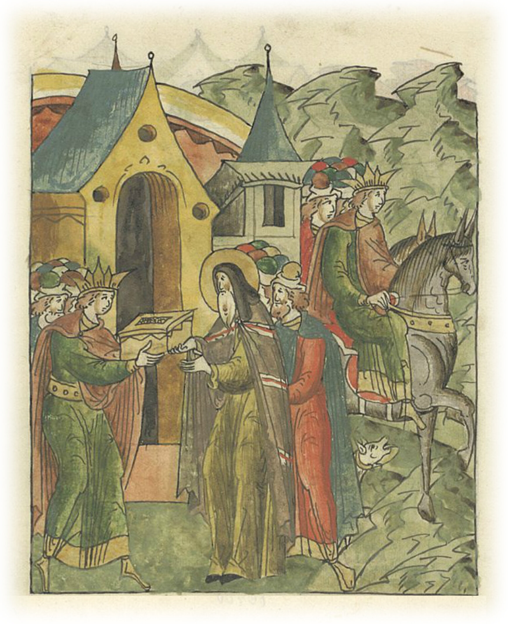 и по этому поводу большое торжество было у царя, который отдал святому много золота для раздачи нищим. После праздника Святого Богоявления отправился царь на охоту,