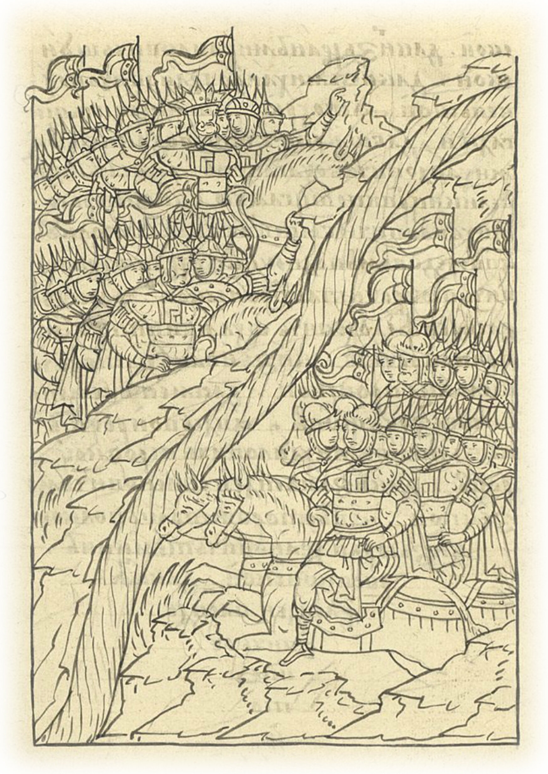 Царь Саип-Гирей с татарами приходит на берег Оки и встает на высоком месте. Воеводы великого князя Ивана Васильевича спешат навстречу царю.