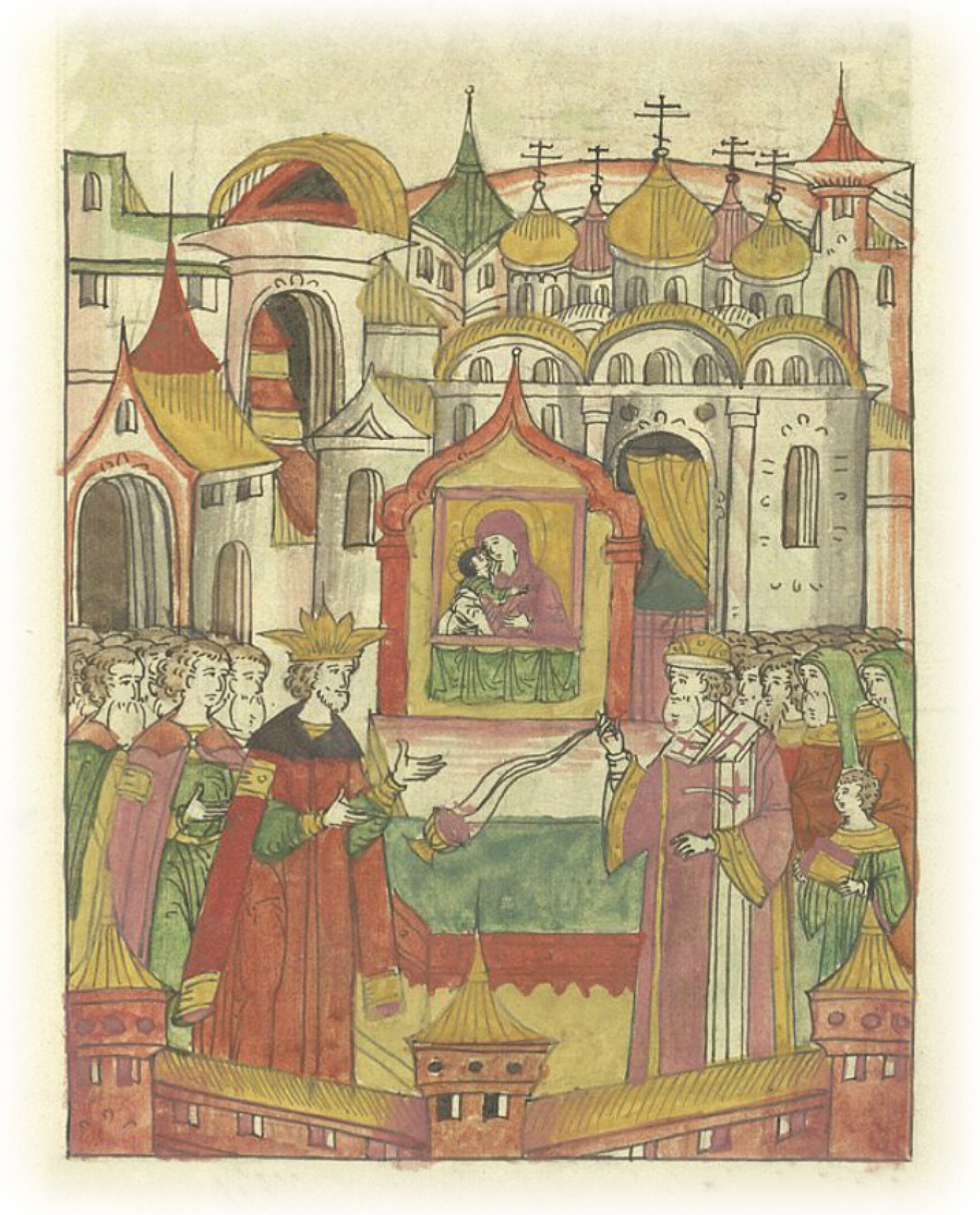 И царь и великий князь, по этому поводу Богу хвалу воздавая, пришел в соборную церковь Успения Пречистой (Богородицы) и Пречистой Богоматери и великим чудотворцам молебен отслужил о таком неизреченном даре и чуде Христа Бога нашего и Пречистой Его Богоматери, и великих чудотворцев.