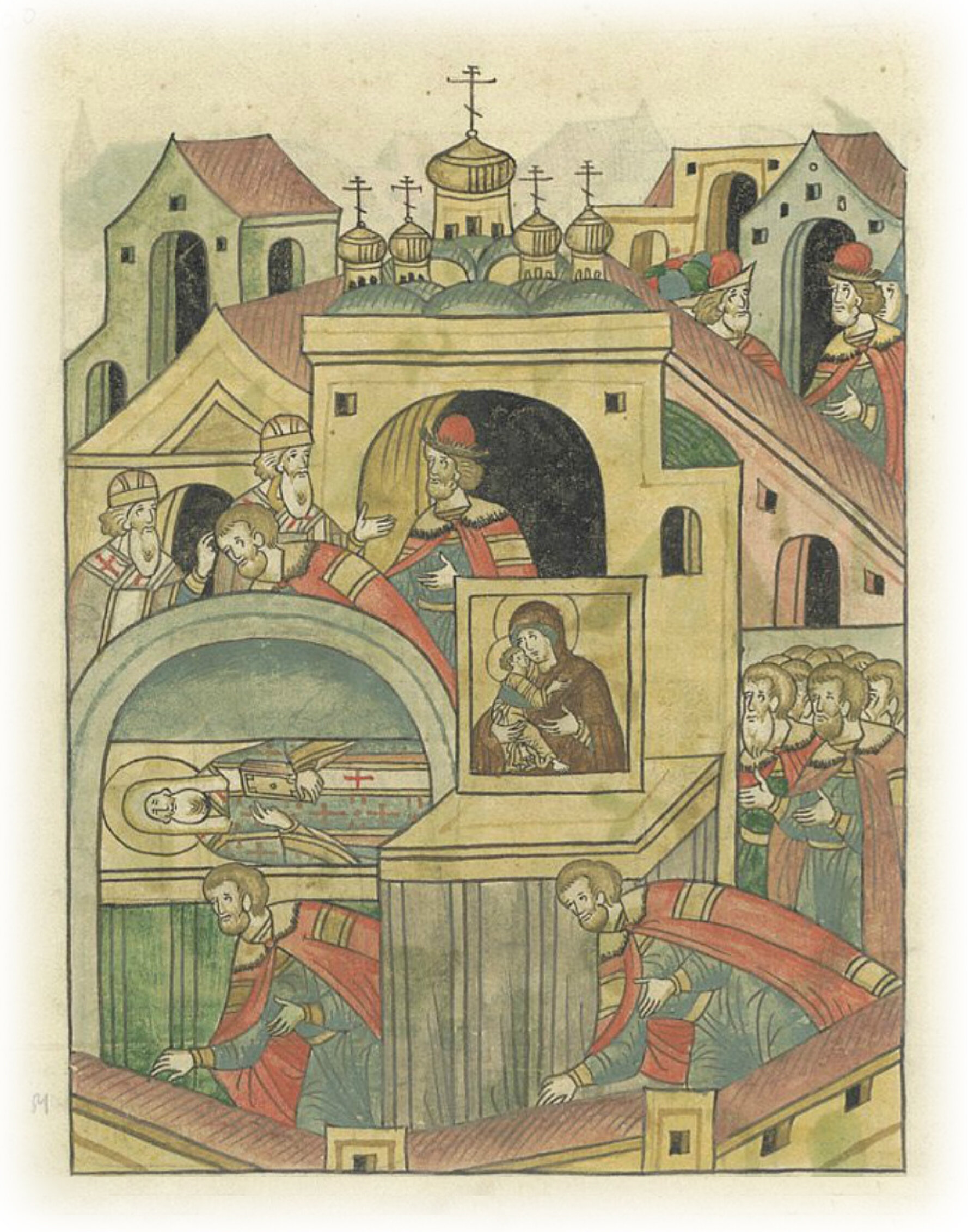 Слышав же сие, князь великий Дмитрий Иванович оскорбился и опечалился очень, и пошел в соборную церковь, и припал со слезами к образу Пречистой Богородицы письма Луки евангелиста и к гробу великого чудотворца Петра, митрополита всея Руси, и благословился у отца своего Киприана, митрополита всея Руси, и сказал ему о Мамаевом нахождении.