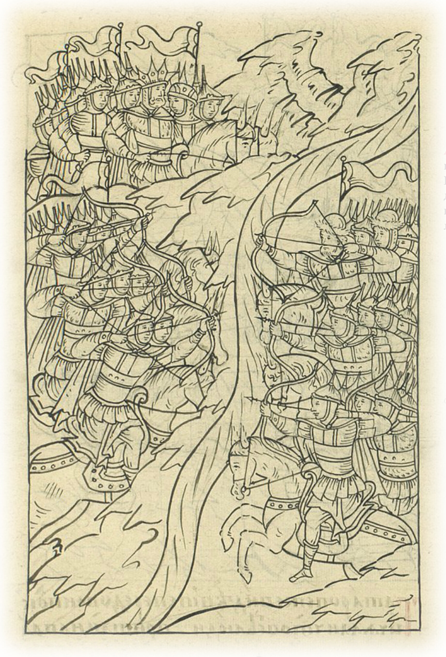 А первым пришел на берег с передовым полком князь Иван Иванович Турунтай Пронский да князь Василий Охлябинин; и начали с татарами стреляться.