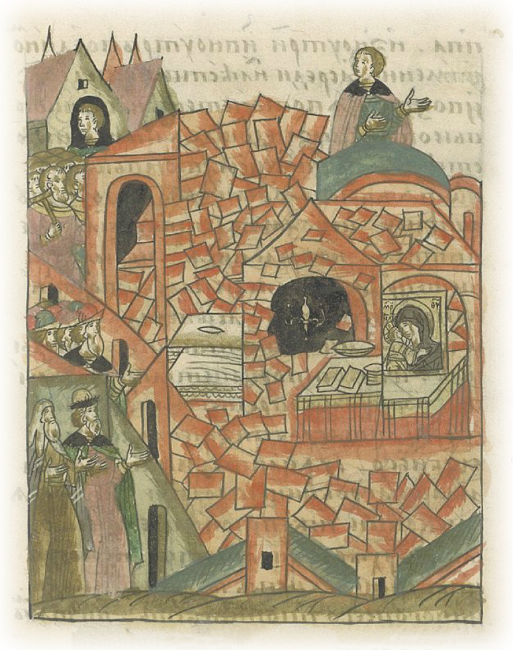 В том же году месяца мая в 20 день, в 1 час ночи упала церковь пресвятой Богородицы, которую начал создавать Филипп, митрополит всея Руси; была же чудна весьма делом, очень высокая и сделана была уже до сводов, которые сводили, чтобы верх большой поставить на них. Поставлена была стена северная над гробами преосвященных митрополитов Ионы и Филиппа изнутри (толщиной) в один камень, а посреди лестница выведена; и возвели ее по той стене на великую высоту, и возвели ее и на переднюю стену, и от великой той высоты и от тяжких сводов, которые (давили) на тонкую стену, не смогла стена та укрепиться и переломилась. И случилось великое разрушение той церкви, так как упала половина передней стены, а северная (стена) вся по алтарь, и палаты, и столпы, и своды все. И чудотворца Петра гроб засыпало, но ничем не повредило его; а Ионы митрополита гроб расщепило, но не разбило его, а у Филиппа митрополита надгробницу немного пробило; а у деревянной церкви, которая в той каменной стояла, верх разбило, а икон и сосудов святых, книг, и свечей, и паникадил, и иного всего, что в ней было, не сдвинуло. Осталось же целого от церкви той – половина передней стены и двери передние, а южная стена вся целая, и столпы ее, и своды, да алтарь весь; но от великого того падения все столпы и стены сдвинулись, а иные изломало, только не упали. Была же об этом печаль немалая великому князю Ивану Васильевичу и митрополиту Геронтию, и всем благоверным князьям, и православным христианам, потому что уже третий год, как прежняя церковь была разобрана, а эта упала из-за грехов наших. Но такое случилось преславное чудо пресвятой Богородицы и по молитве великих чудотворцев: весь тот день каменосечцы те работали на церкви, одни своды вели, а другие их смыкали, носили камень и известь, и дерево; многие же, поднимаясь, смотрели на их работу. За один час до захода солнца спустились все строители, но некоторые еще поднимались посмотреть. Потом же все уже спустились в первом часу ночи, а иные за пятую часть только до первого часа сошли; и еще (часы) первый час не ударили, и тогда (церковь) упала; а один отрок, сын князя Федора Пестрого, еще ходил по сводам тем, и когда услышал треск и падение камней, испугался, побежал на стену южную в оторопи и после падения того вышел из церкви той ничем невредим.