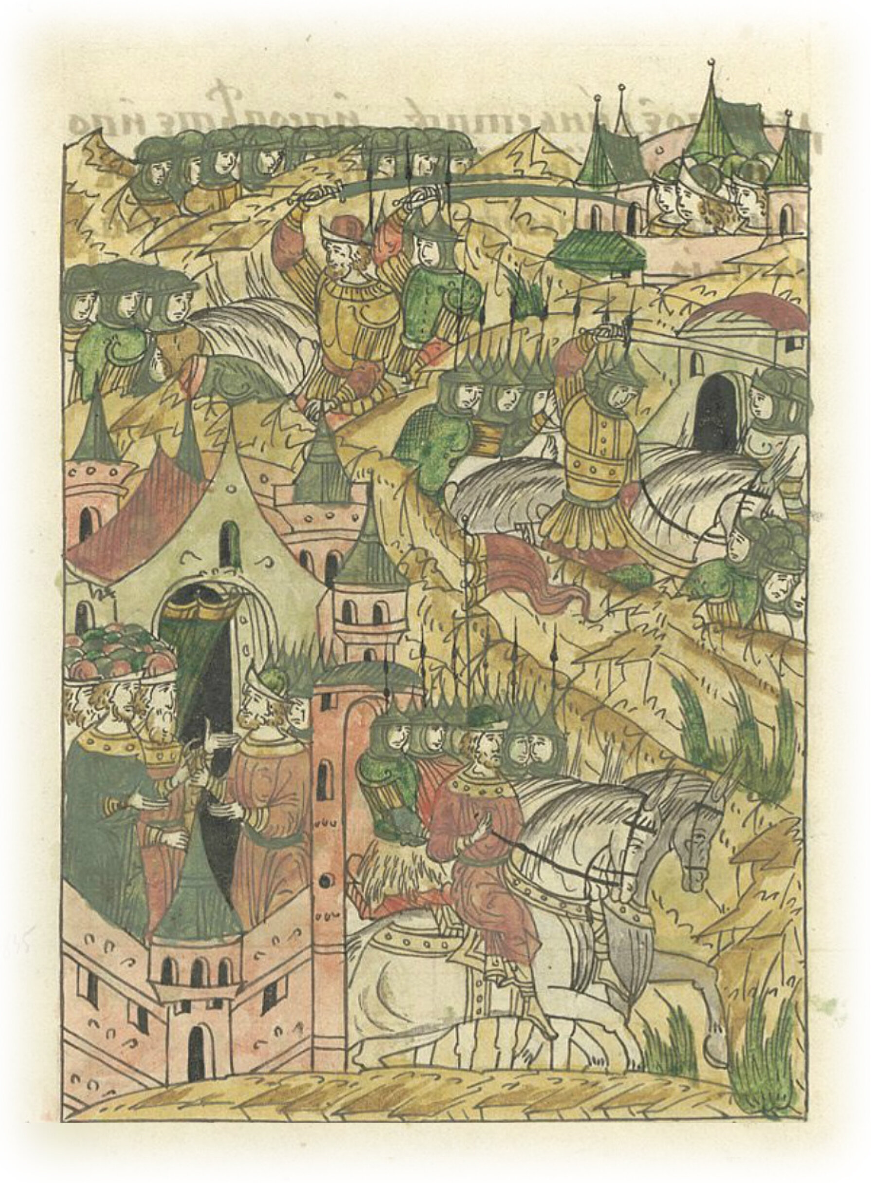 Языки говорят воеводам царя Ивана Васильевича, что магистр окопался большим рвом вокруг города Рындола, бьет из пушек и пищалей и приступает к Рындолу.