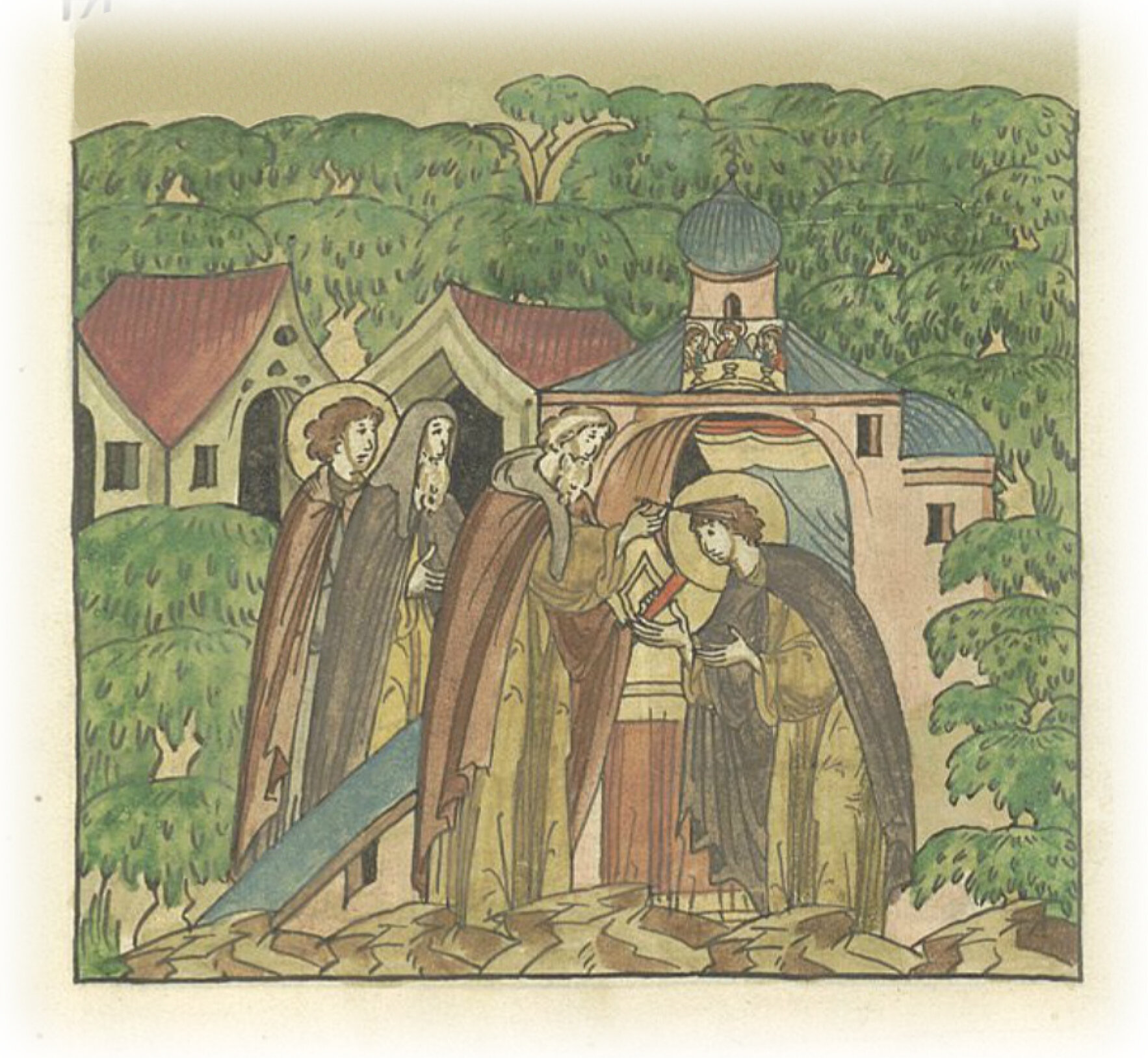 Повесть о преподобном Сергии Радонежском. Игумен Митрофан постригает Варфаломея в иноческий чин с именем Сергий в церкви Пресвятой Троицы.