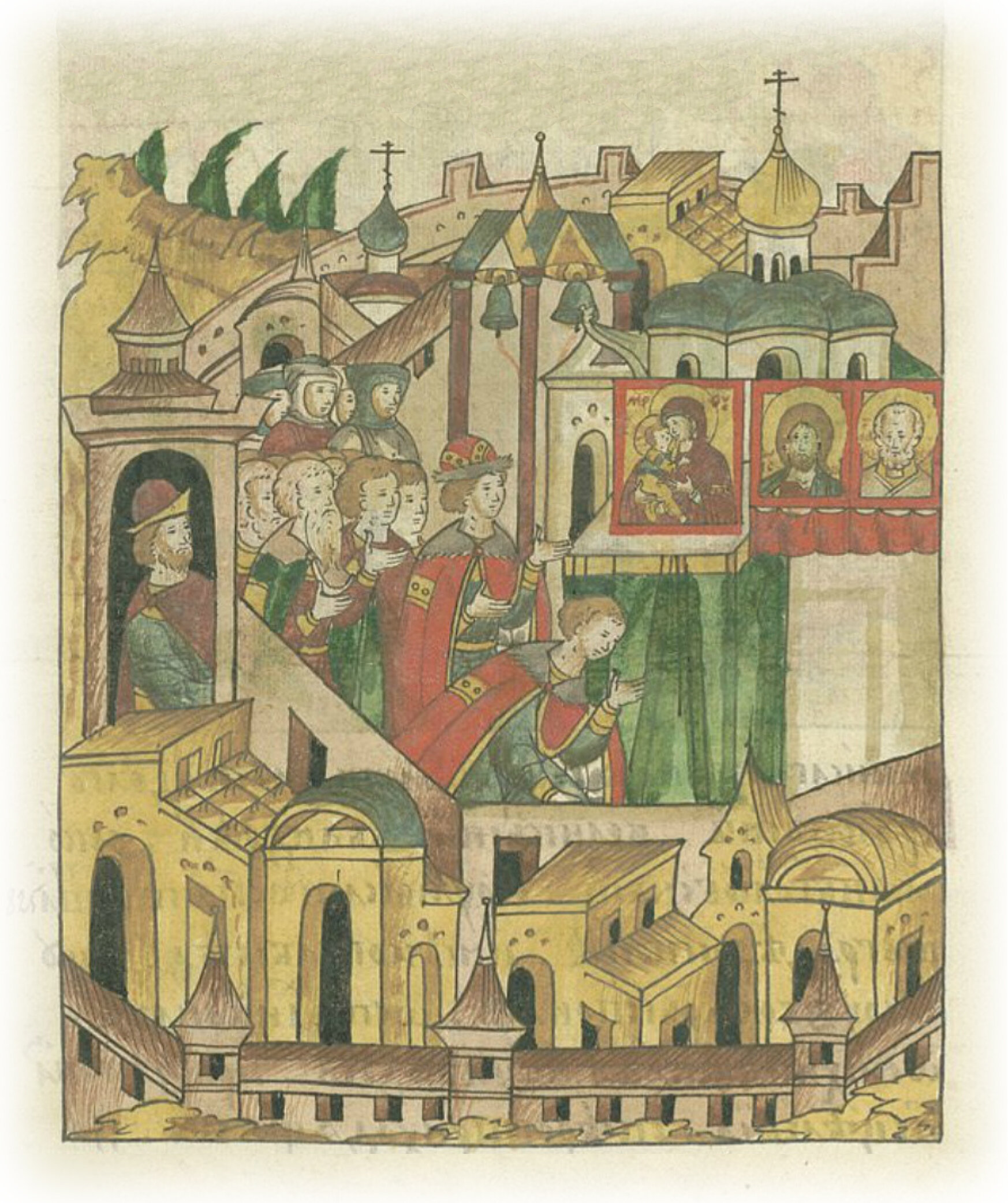 Великий князь Андрей Боголюбский, задумавший властвовать в Ростове, узнает о чудотворной иконе пречистой Богородицы, поставленной в Девичьем монастыре в Вышгороде, приходит в этот монастырь и молится перед иконой, прося быть помощницей в Ростовской земле.