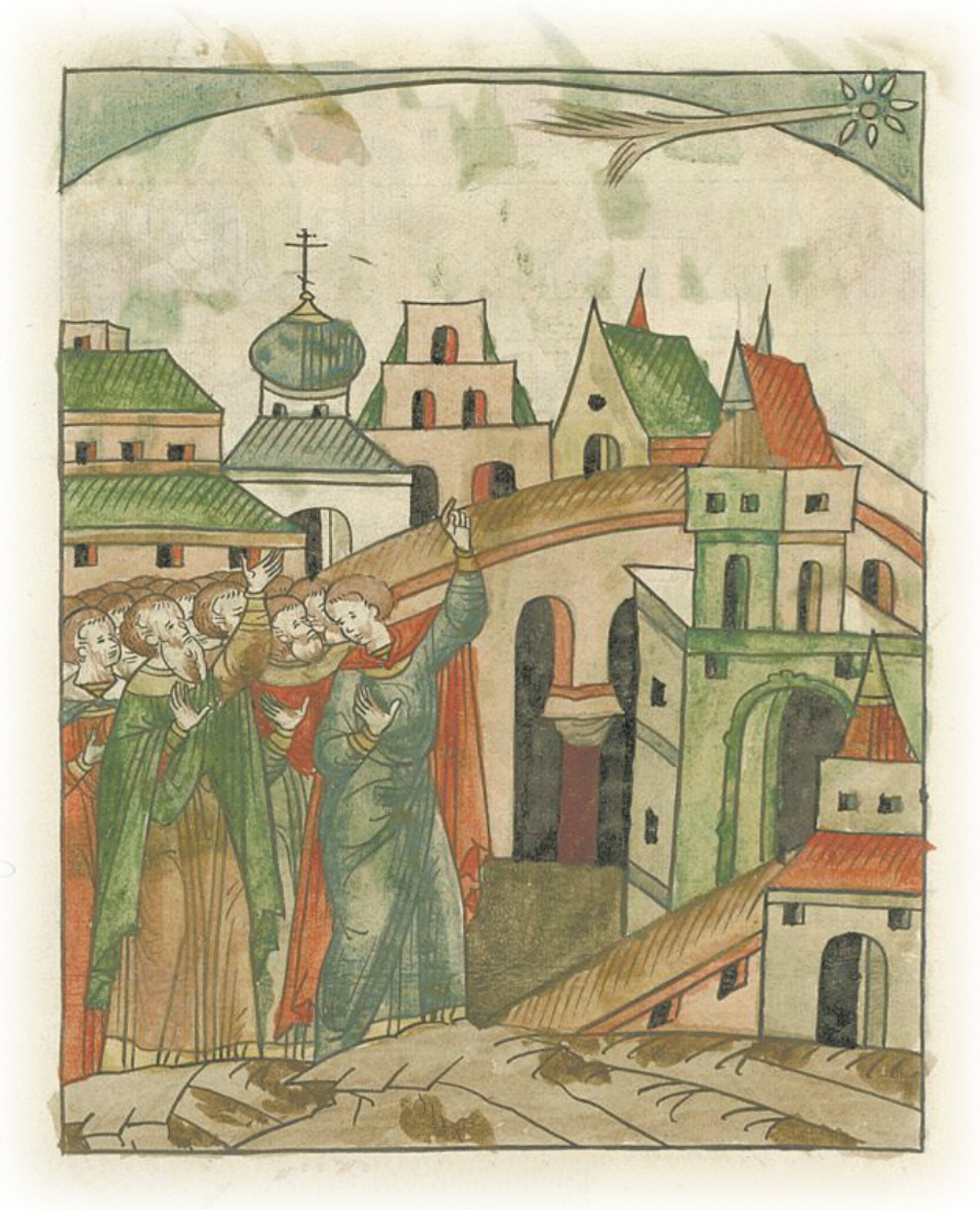 О знамении. В том же месяце в 9 день, во 2-м часу ночи с воскресенья на понедельник, явилась на небесах хвостатая звезда, хвост ее был протяженностью на восток в две сажени, и пробыла она на небе до 6 часов ночи.