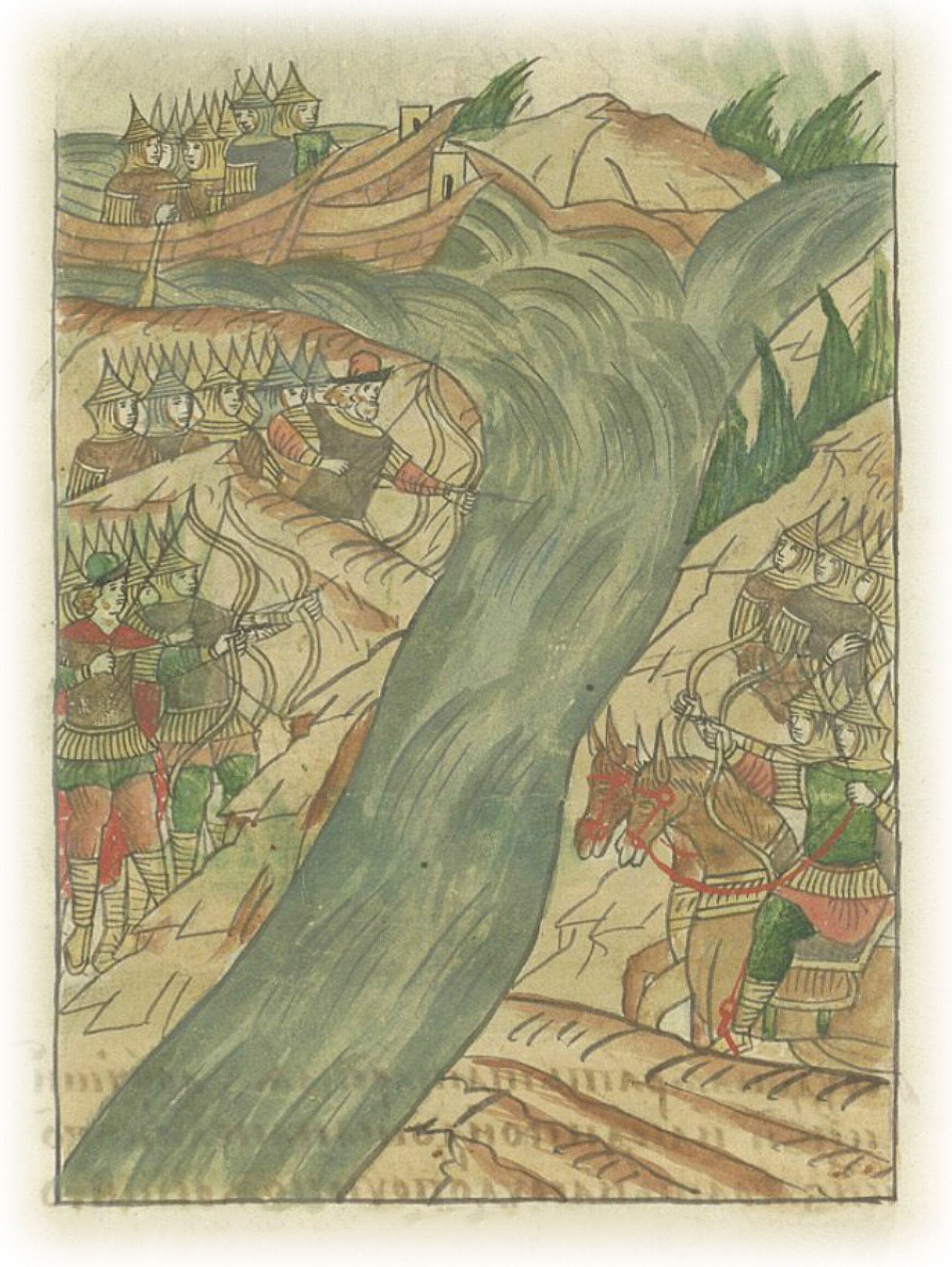 Татары приходят на конях и начинают стрелять в суда с воинами великого князя Ивана Васильевича.