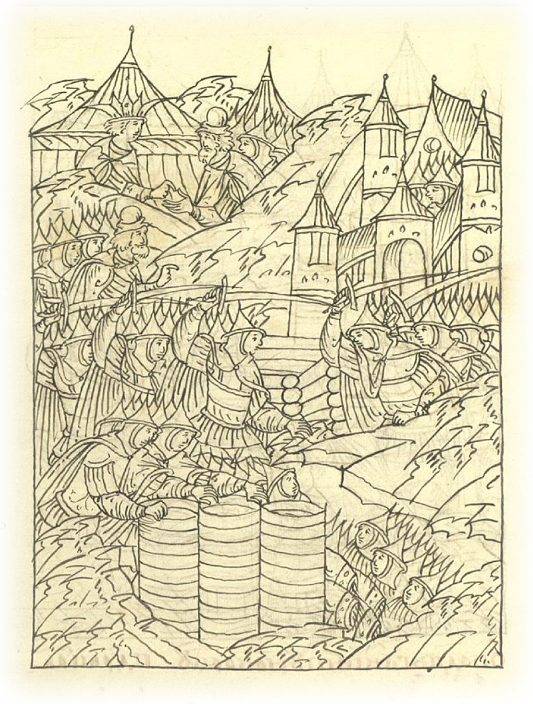 Татары же жестоко бились, не желая дать приблизиться православным; воеводы же царевы, уповая на Бога, по государеву велению приближались ко рву.