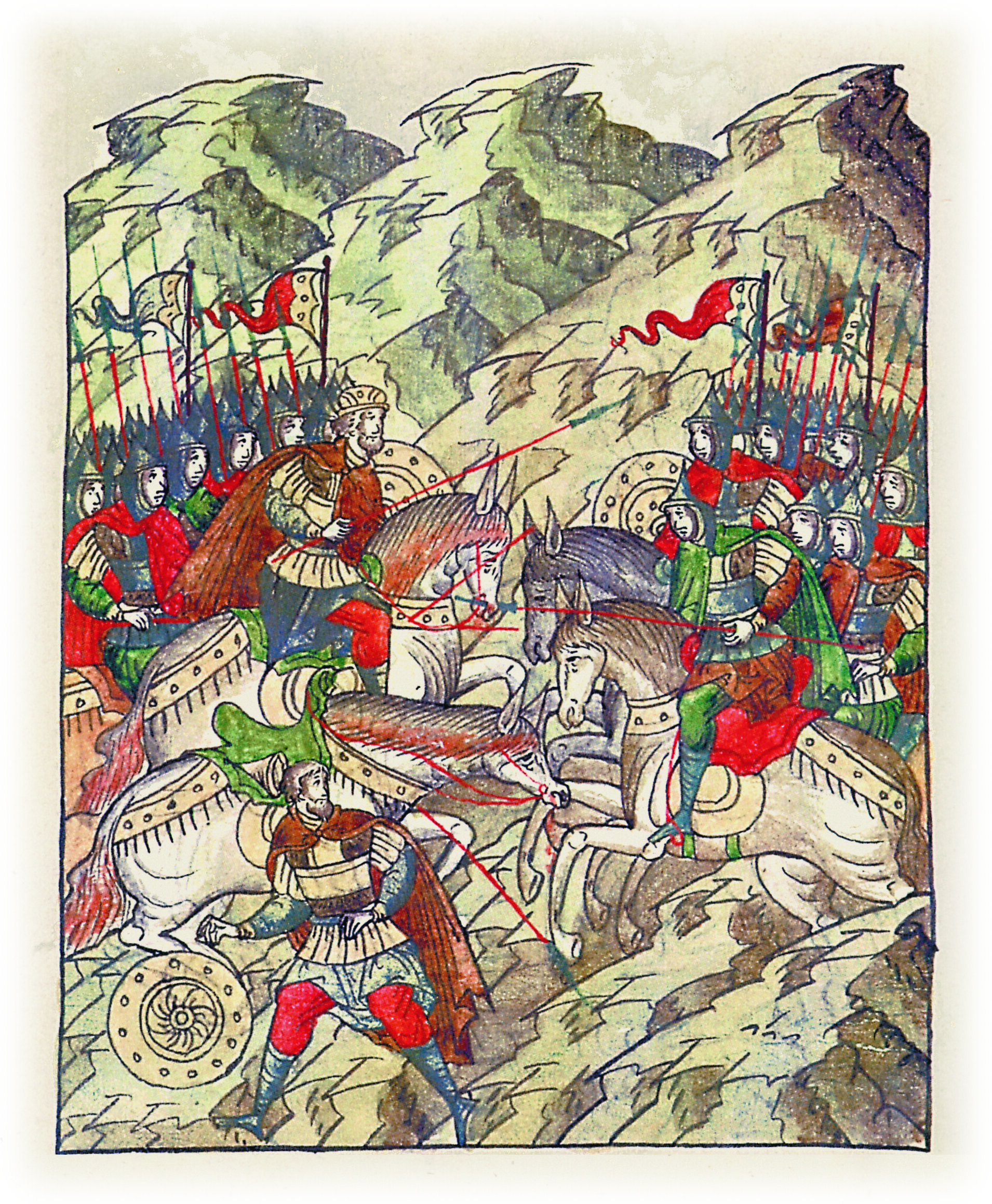 и, взяв копье свое, пошел на брань с дружиной своей; и раньше всех сошелся с противником, и изломал копье свое, и тогда был ранен под ним конь в ноздри, он же начал метаться туда и сюда, и шлем с него упал, и щит у него упал; но Божиим заступлением и пречистой Богородицы, и молитвой родителей своих сохранен был без раны.