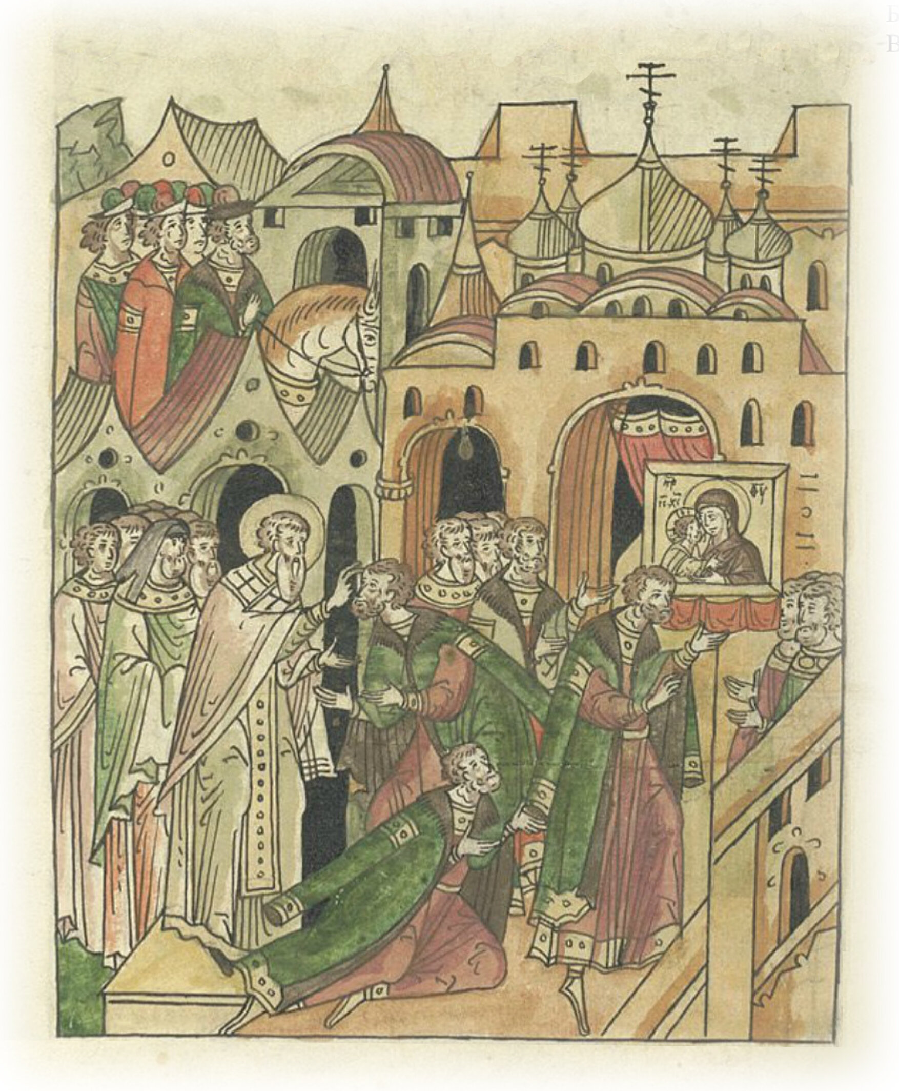 Князь Глеб Василькович Ростовский с сыном Михаилом и пемянником Константином Борисовичем приходят в Ростов из Орды, молятся в церкви и берут благсловение у Ростовского епископа Игнатия.