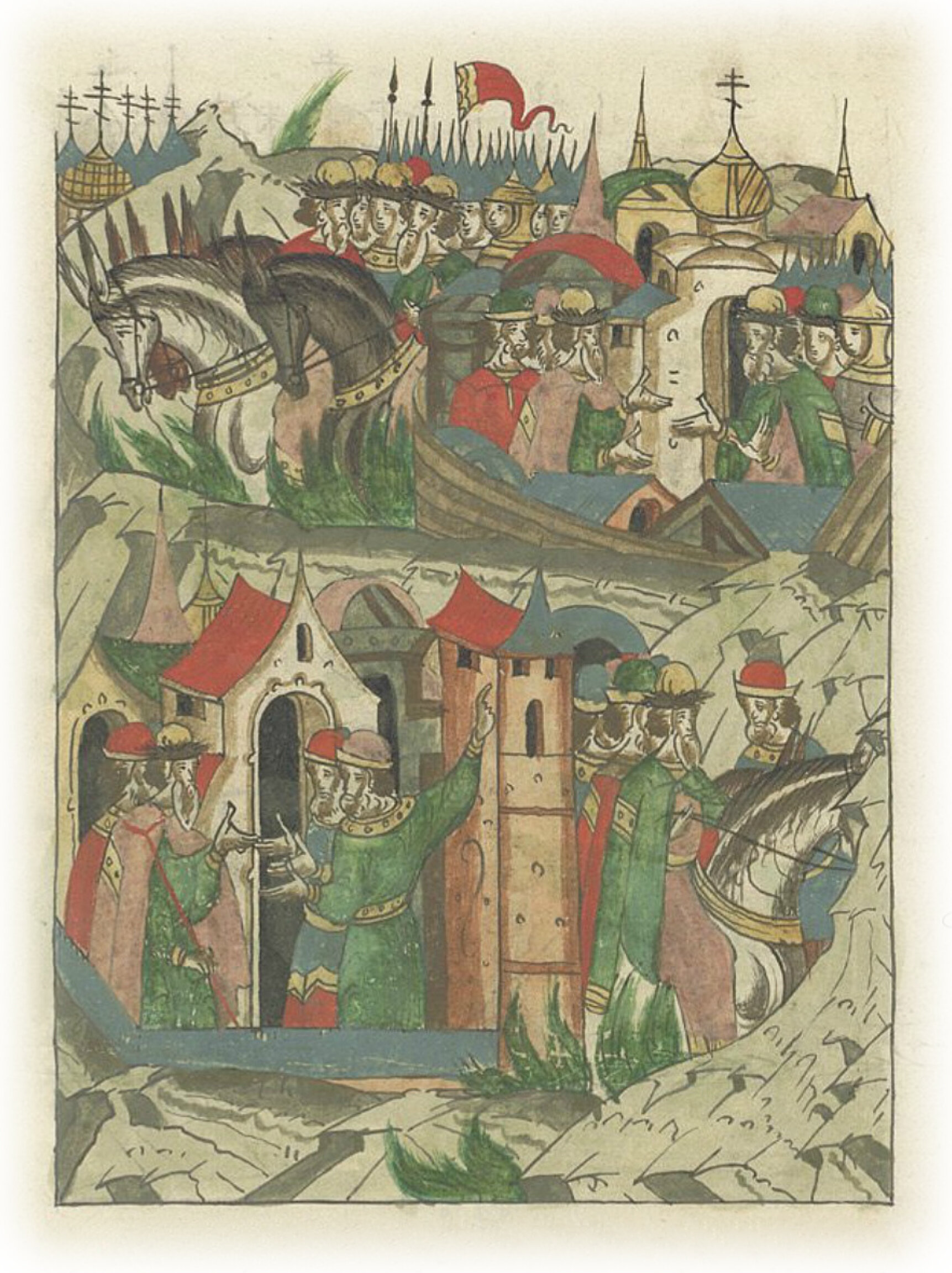 Ругодивские посадники Яким и Захар приезжают в Москву. Воеводы царя Ивана Васильевича Алексей Адашев и Иван Михайлов сообщают им, что государь пожалует их, если сдадут его воеводам помимо Ругодива Вышгород.