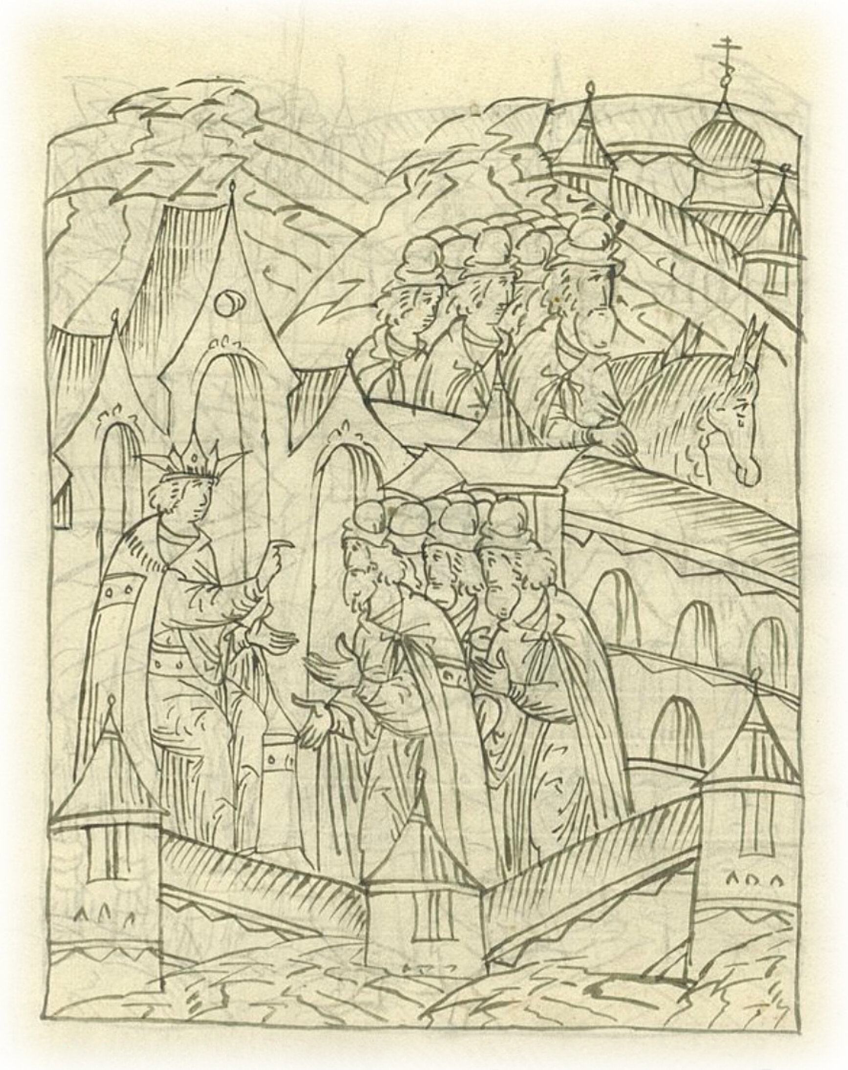 Ругодивские посадники Яким и Захар приезжают в Москву. Воеводы царя Ивана Васильевича Алексей Адашев и Иван Михайлов сообщают им, что государь пожалует их, если сдадут его воеводам помимо Ругодива Вышгород.