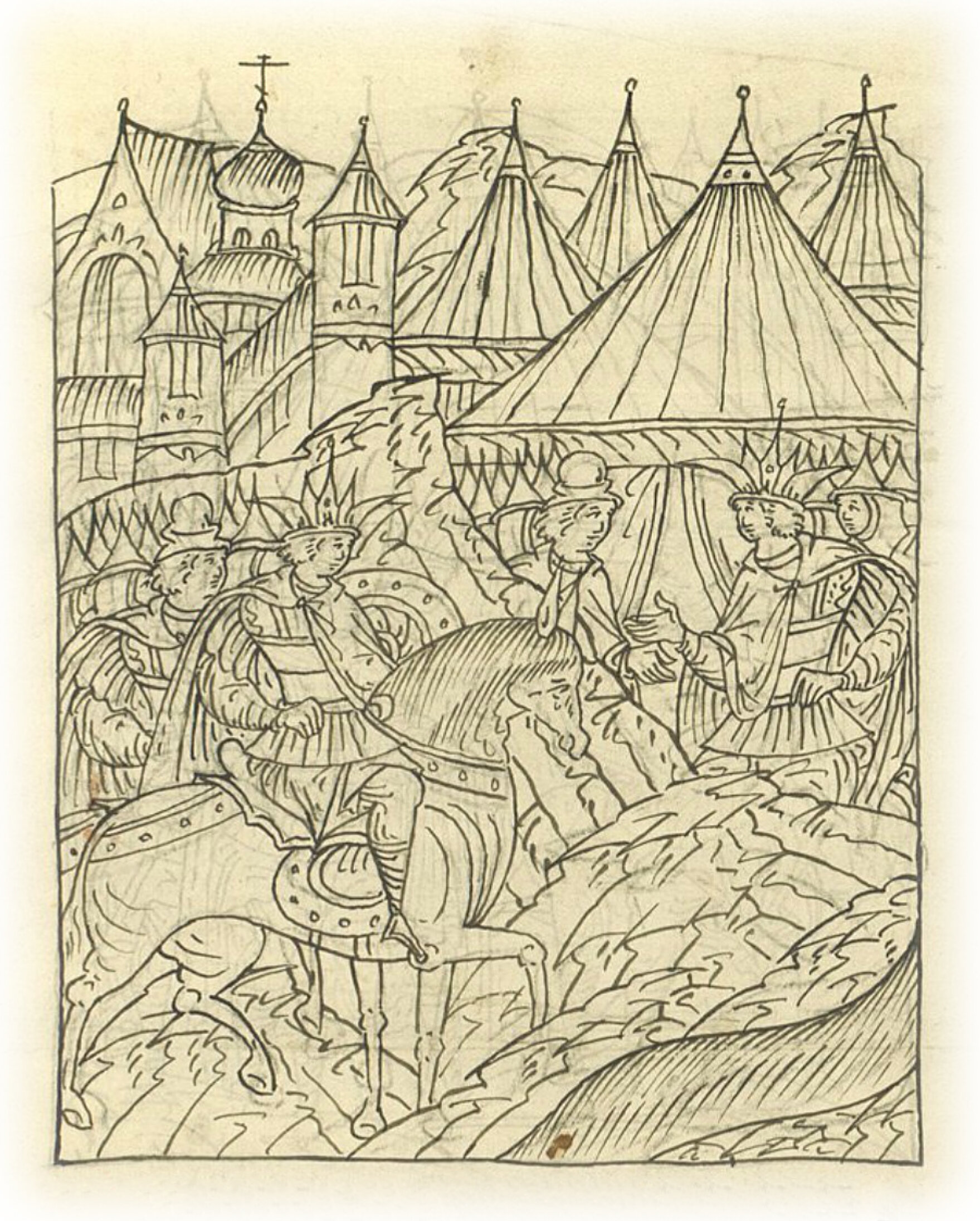 И поехал государь на луг, и встал в шатрах на лугу под Свияжским городом. И повелел государь у себя быть царю Шигалею.