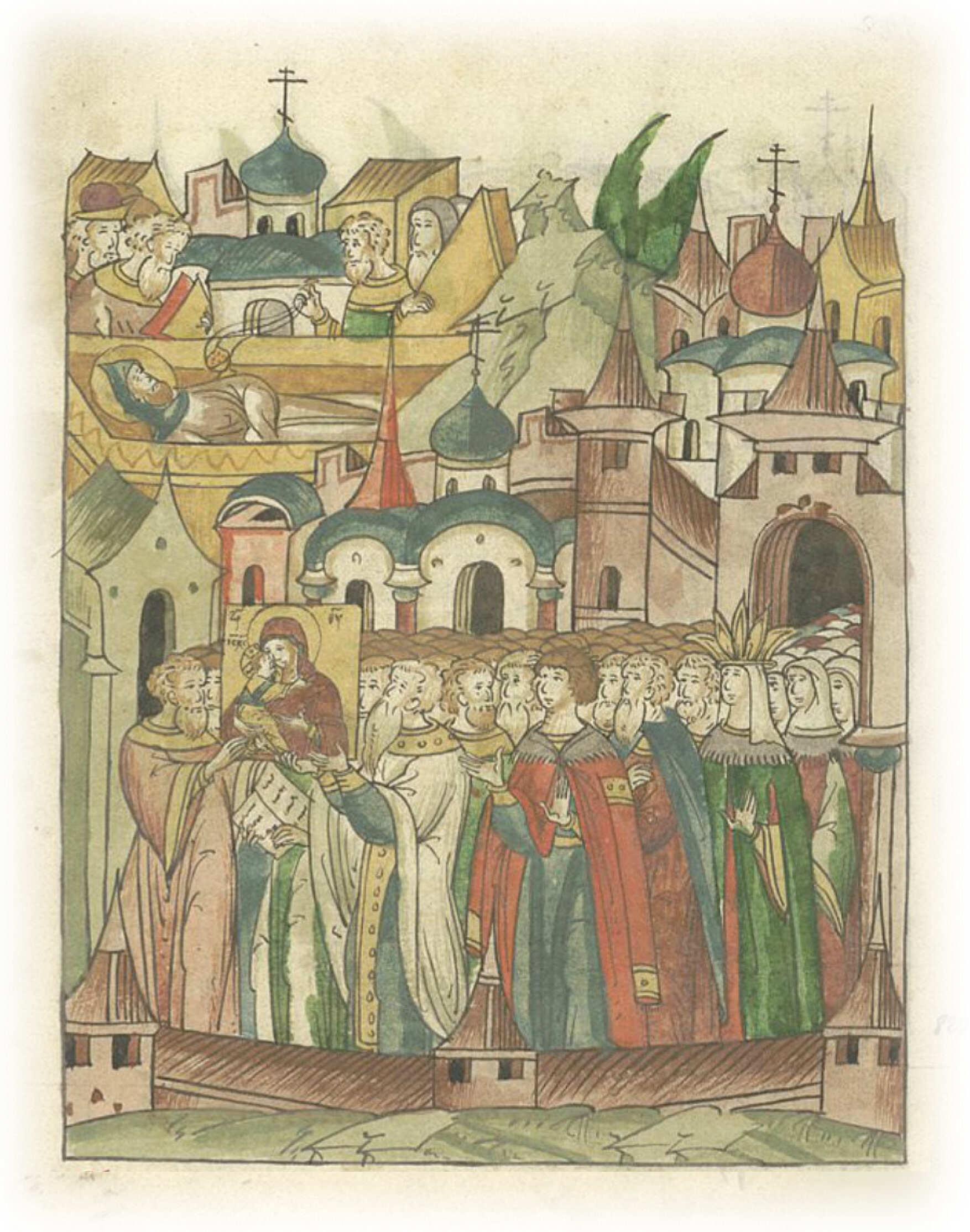 И тайно ночью вышли из Вышгорода с княгиней своей, с боярами и со многими людьми. Взял с собой и вышегородского пресвитера, иерея Николу, и зятя его дьякона Нестора с его супругой. И пошли, совершая по пути молебны. Великий князь Георгий в том же году отошел к Богу месяца мая в 15 день. И похоронен был у Спаса на Берестове.