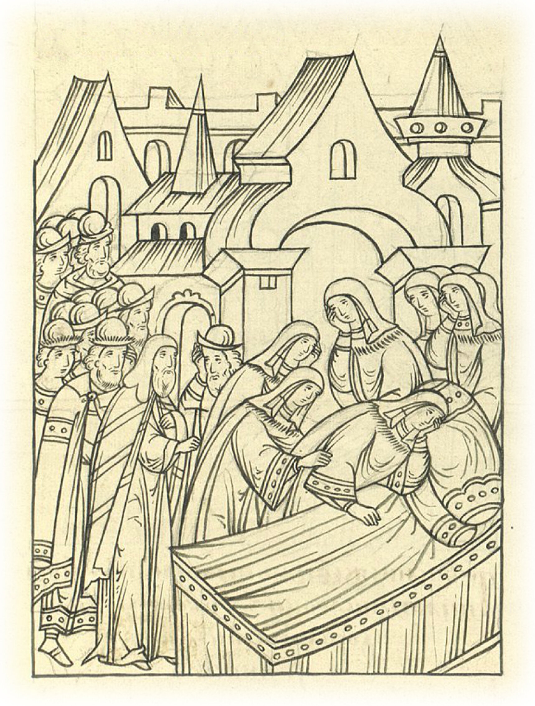 Тогда же митрополит Даниил с братьями великого князя и с боярами пошел к великой княгине утешать ее; великая же княгиня, видя митрополита и бояр, к себе идущих, и стала как мертвая, и лежала часа с два, и едва очнулась.