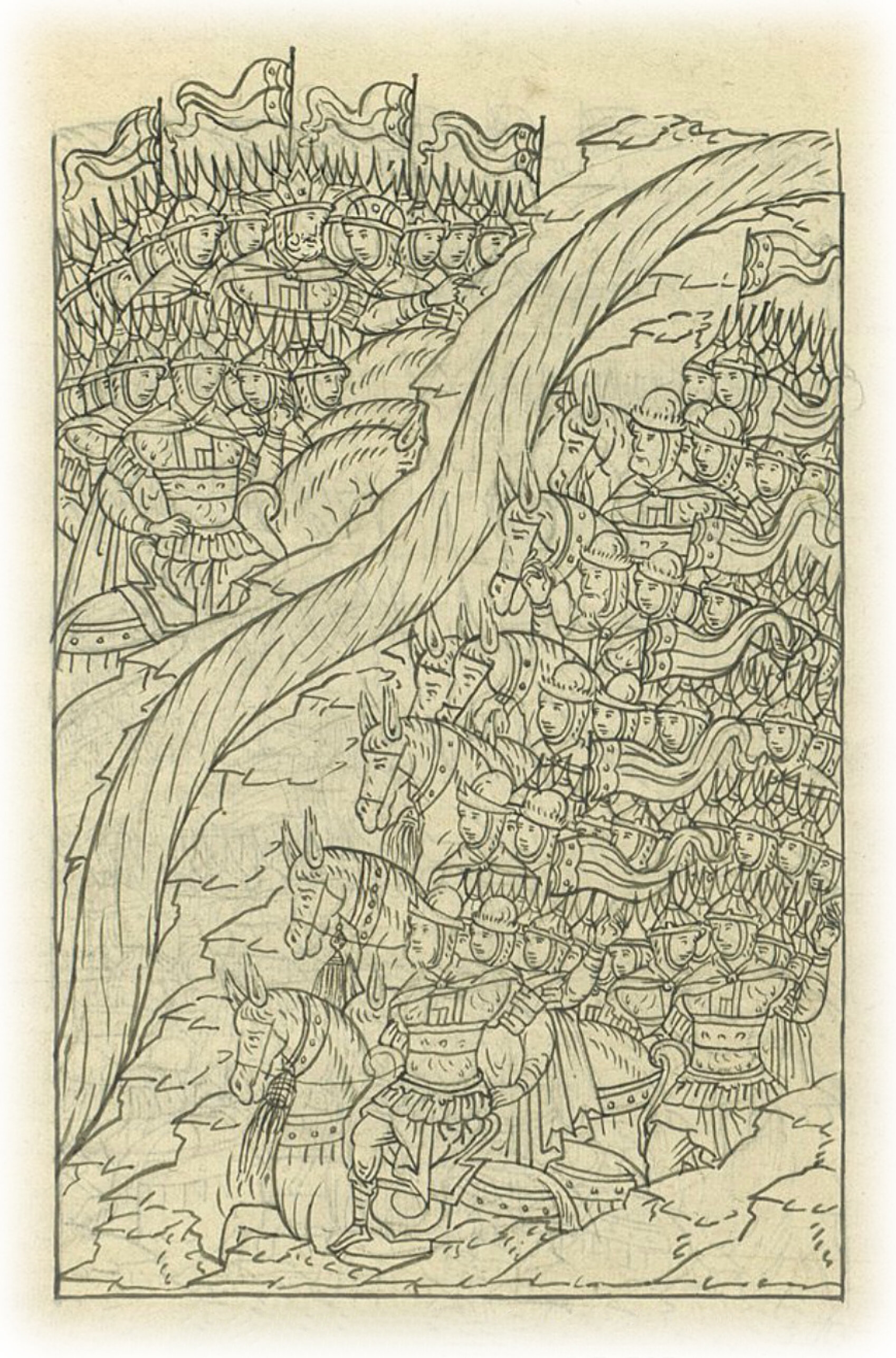 И увидел царь: идут большие полки, да и полк правой руки, и левой; и начал царь смотреть и удивляться, что идут люди многие, устроив полки, так что красиво смотрится; а люди в разноцветных доспехах, каждый воевода в своем полку; и пришли против царя на берег.