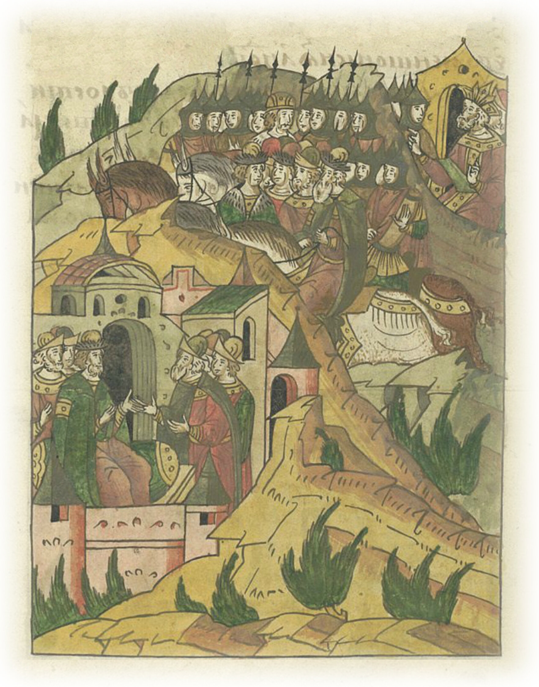 Ордынский царь, выслушав жалобы русских князей на великого князя Дмитрия Александровича Владимирского, отпускает с ними своего брата Дюденя с воинством. Князья с татарами выступают против Дмитрия Александровича.