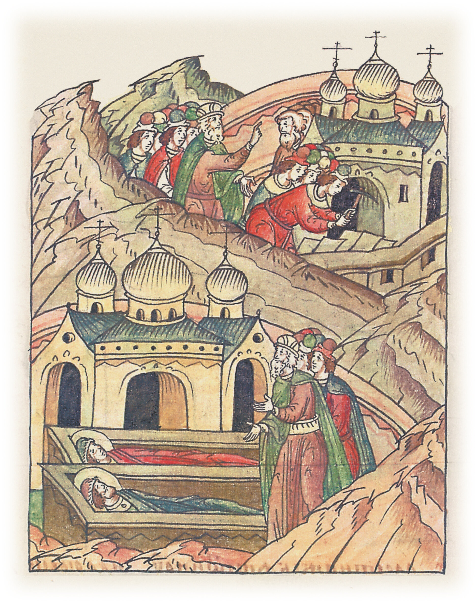 И церкви, и монастыри создавал и украшал, чтил священнический и иноческий чин, и довольство всяческое давал им на потребу. И веру великую имел к сродникам своим, к святым мученикам Роману и Давыду*, и церковь прекрасную создал на Альте во имя их, где святого Бориса кровь пролита была. * т.е. Борису и Глебу.
