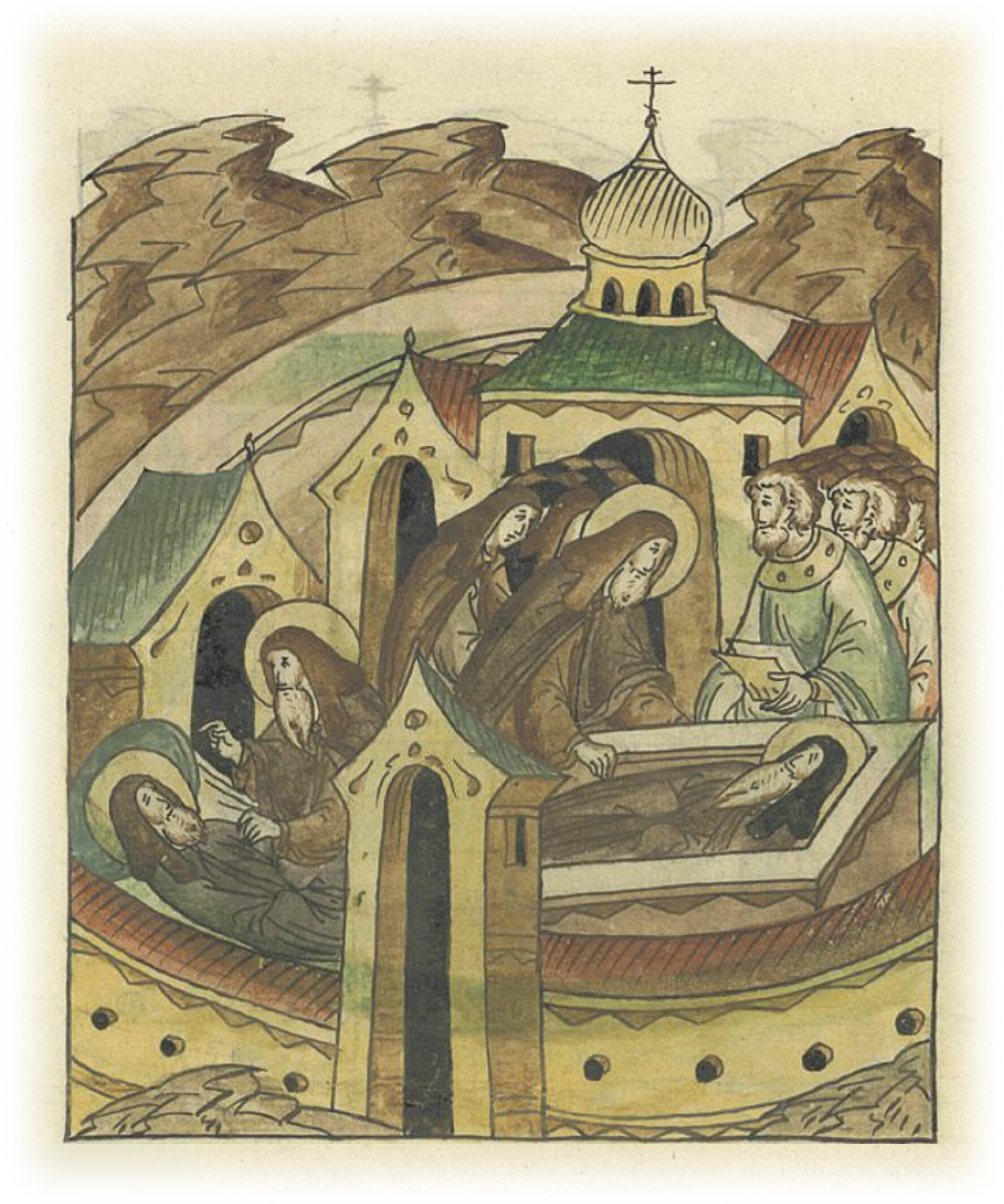 Потом же явился святой во сне одному святому старцу, повелел вынуть тело его из земли; и положили его в церкви на поклонение всем видимого. И в Загорской земле, где была первая его могила, многие чудеса происходили во славу Божью.