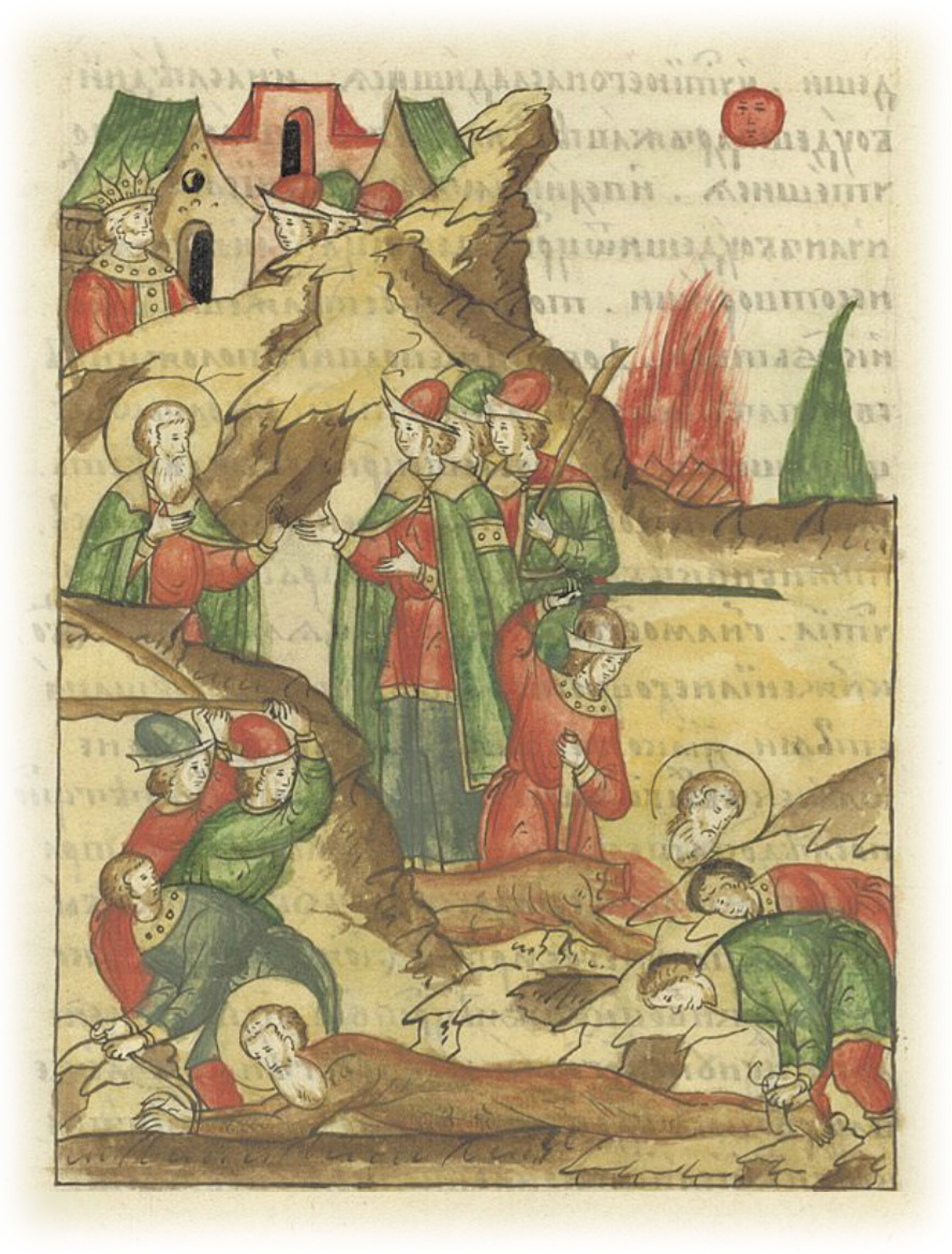 Услышав сей священный ответ великого Феодора, скверные татары бесновались гневом, ибо видели его непреклонным, и, как звери свирепые, с яростью устремились на него, скверными руками схватили его, и без милости мучили, так же как и великого князя, и плоть его раздробили.