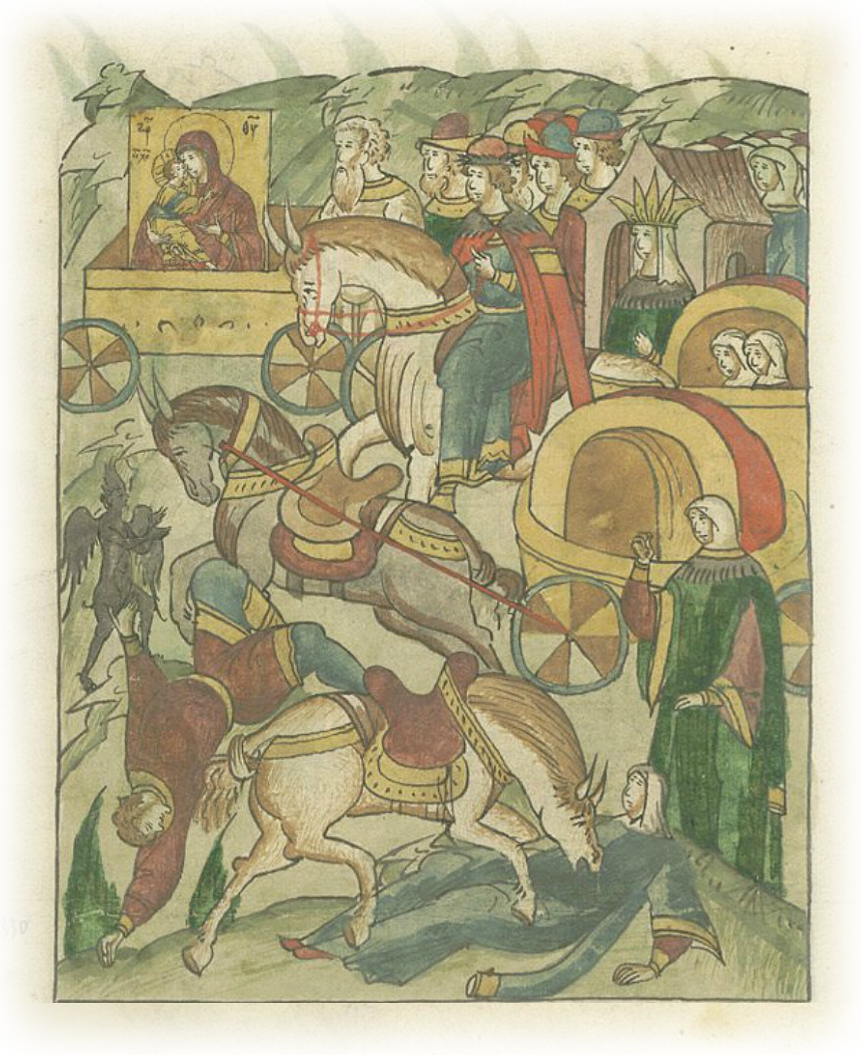 О жене, которая была убита конем и ожила. (Это случилось), когда люди приехали на Рогожские поля. И жена выше упомянутого пресвитера Николы хотела сойти с повозки. По дьявольскому же наущению конь стал неистово свирепствовать и сбросил с себя служащего иерея, сломал ему ногу, а жену иерея ногами затоптал, и, схватив зубами, волочил ее по земле, пока она не перестала дышать.