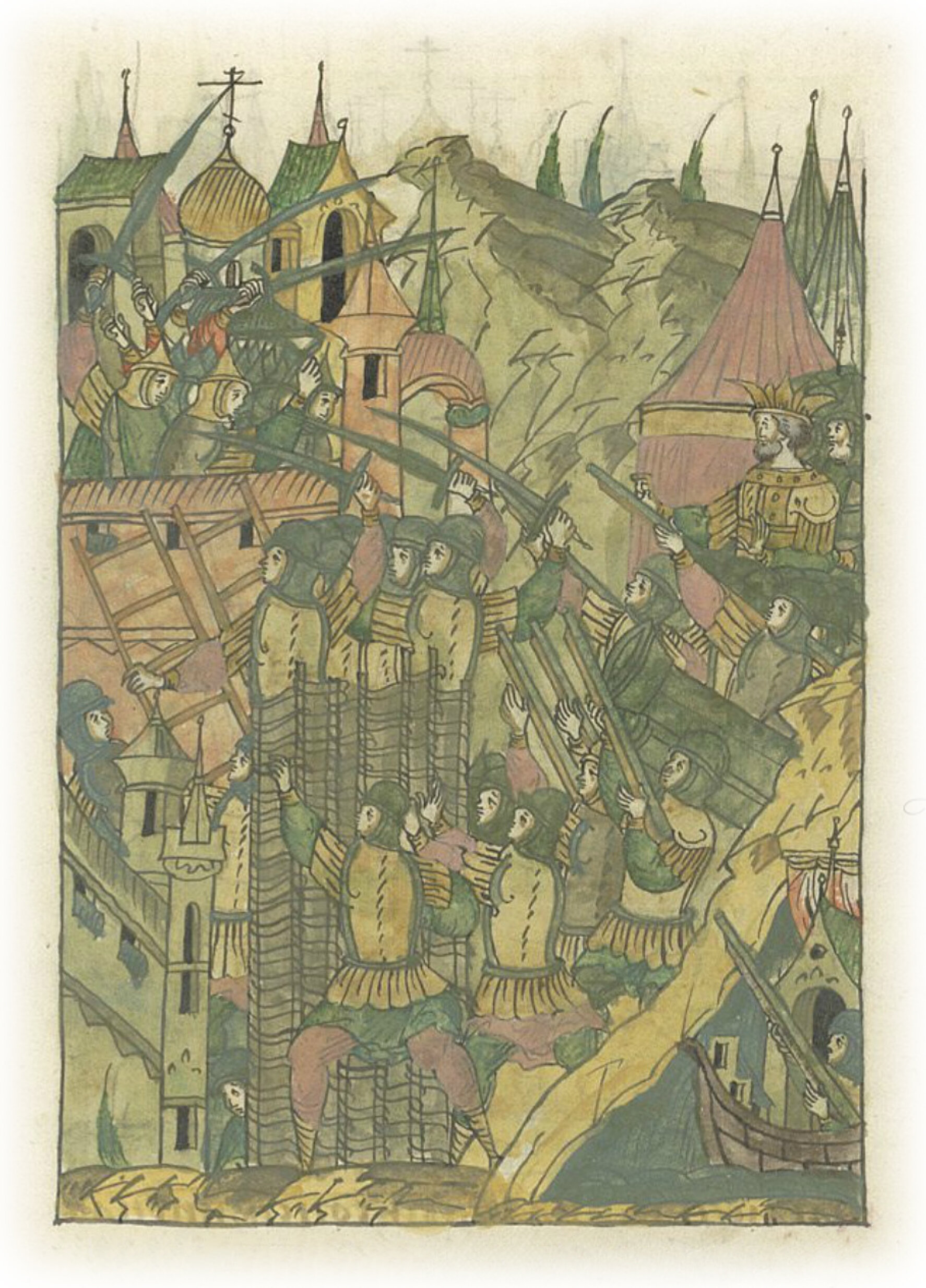 вскоре придвинули ограждения деревянные и туры высокие, и лестницы бесчисленные, желая силой взойти на стену; но греки им не давали и бились с ними крепко.