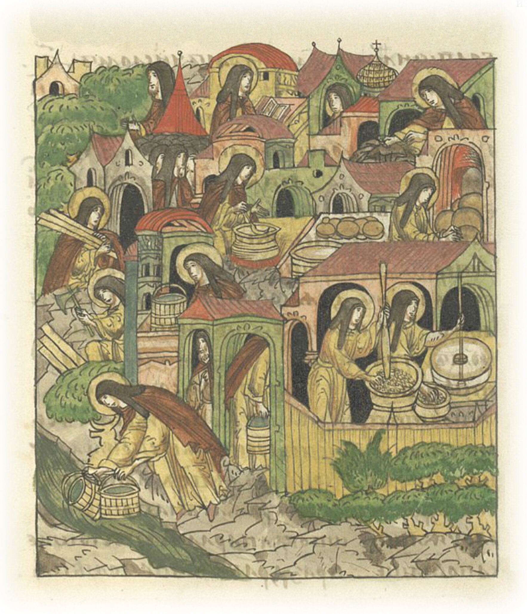 Сам же Сергий сначала из-за своего великого и полного смирения не хотел быть поставленным в священники или игумены, во всем подражая своему владыке – Господу нашему Исусу Христу, который сказал желающим следовать за Ним, подражая Ему: «Придите ко Мне все труждающиеся и обремененные, и Я успокою вас. Возьмите иго Мое на себя и научитесь от Меня, ибо Я кроток и смирен сердцем». И собралось там 12 монахов. Среди них были: Василий, называемый Сухой, пришедший с верховьев Дубны; другой – Яким по прозванию Якута. Этот Якута был за посыльного: его всегда посылали, когда нужно было приобрести необходимое для службы, без чего нельзя было жить и терпеть. Третий – Анисим, который был дьяконом, и отец дьякона по имени Елисей. Когда соорудили кельи, оградили их тыном, но не очень высоким, и у ворот поставили сторожа. Сам Сергий построил своими руками три или четыре кельи. Выполнял и другие монастырские работы, необходимые для жизни братии: иногда на плечах своих из леса носил деревья, колол их на поленья и по кельям братьям разносил, работал и служил как раб купленный, дрова для всех заготавливал и, как говорится, сек, толок и молол, хлебы пек, еду варил и всякую пищу готовил для нужд братии; обувь и одежду кроил и шил. И от источника, который там был, носил воду на плечах своих в двух водоносах и каждому у кельи ставил. И ночи проводил без сна, молясь и читая, и ни часа не был праздным. Питался же хлебом и водою и то не досыта. И так утомлял тело свое воздержанием и трудами, что плотские чувства утолял и телесное жжение погашал, и стрелы лукавого без волнения отметал, подвиги к подвигам прилагая. И заботился о процветании места того пустынного, чтобы труд его был на пользу. И, что бы он ни делал, всегда на устах его был псалом, в котором сказано: «Видел Господа пред собою всегда, ибо он всегда справа от меня, да не поколеблюсь!» И всегда он находился в трудах, поты проливая. И так плоть свою измучил, иссушил и усыпил, желая быть небесным (жителем), что все остальное почитал за ничто.