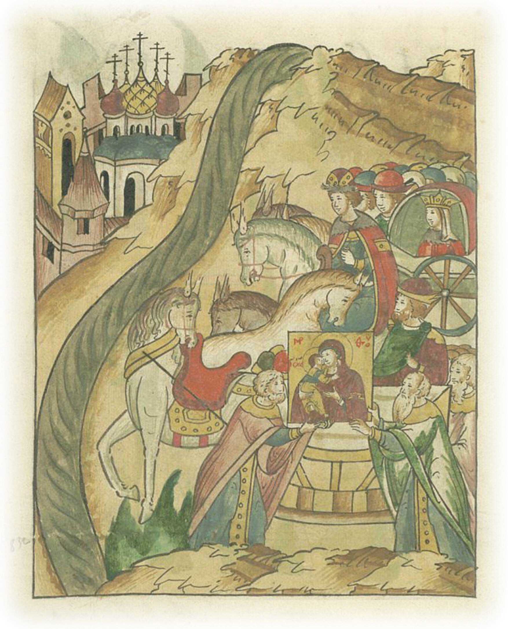 Чудо о месте, называемом Боголюбово. И оттуда дошли до города Владимира. И когда были недалеко от него, на реке Клязьме, кони, которые везли икону Богоматери, встали и не хотели двигаться дальше. Коней поменяли и перенесли чудотворную икону в сани. И ни один конь не мог двинуться со святой иконой.