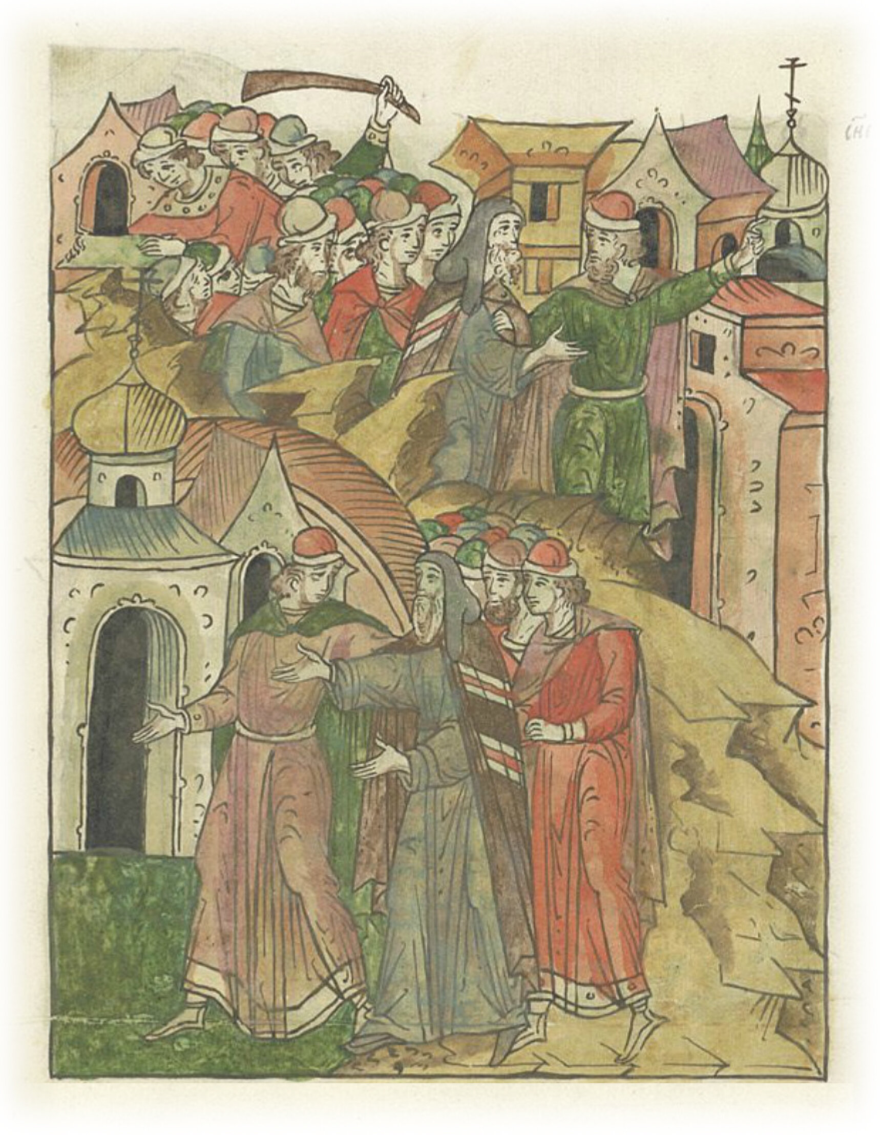 И так свели его на Хутынь, а Антония с Хутыни ввели на архиепископский двор; и был великий мятеж в городе, некоторые были разграблены, другие же вкусили смерть.