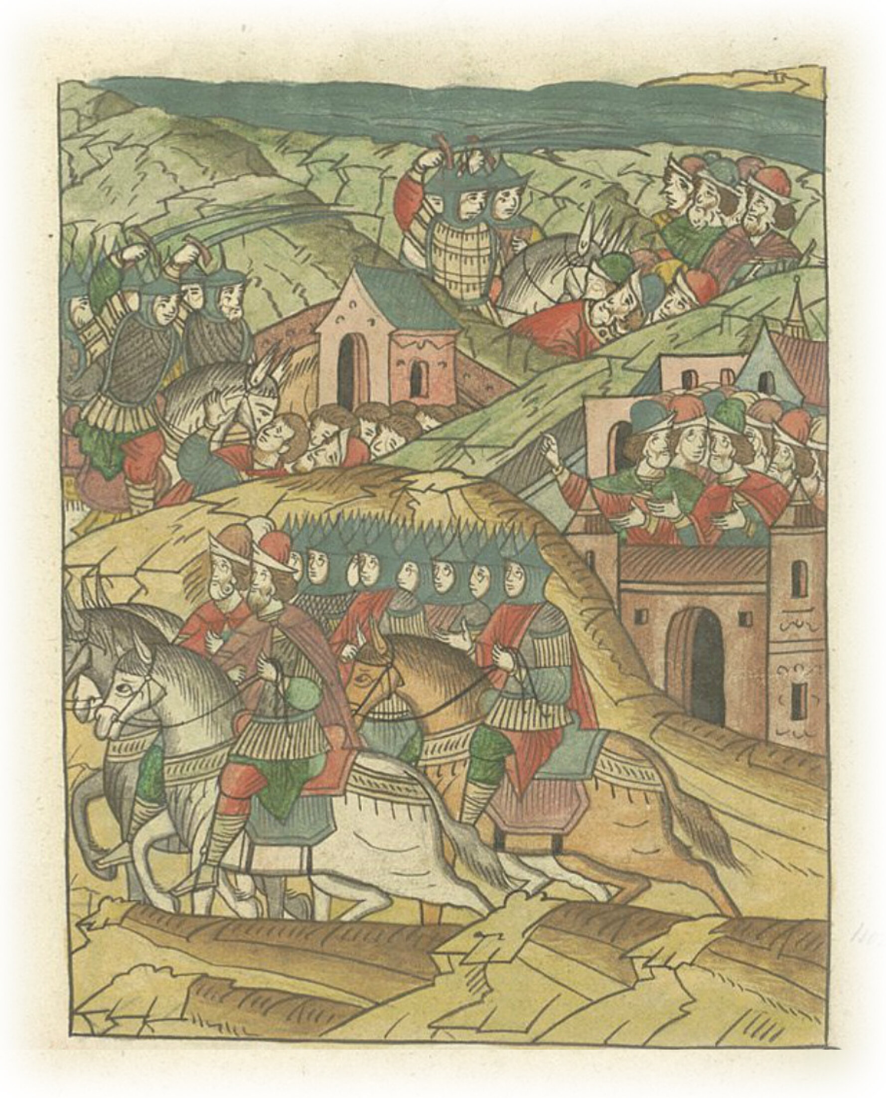 Языки говорят воеводам царя Ивана Васильевича, что магистр окопался большим рвом вокруг города Рындола, бьет из пушек и пищалей и приступает к Рындолу.