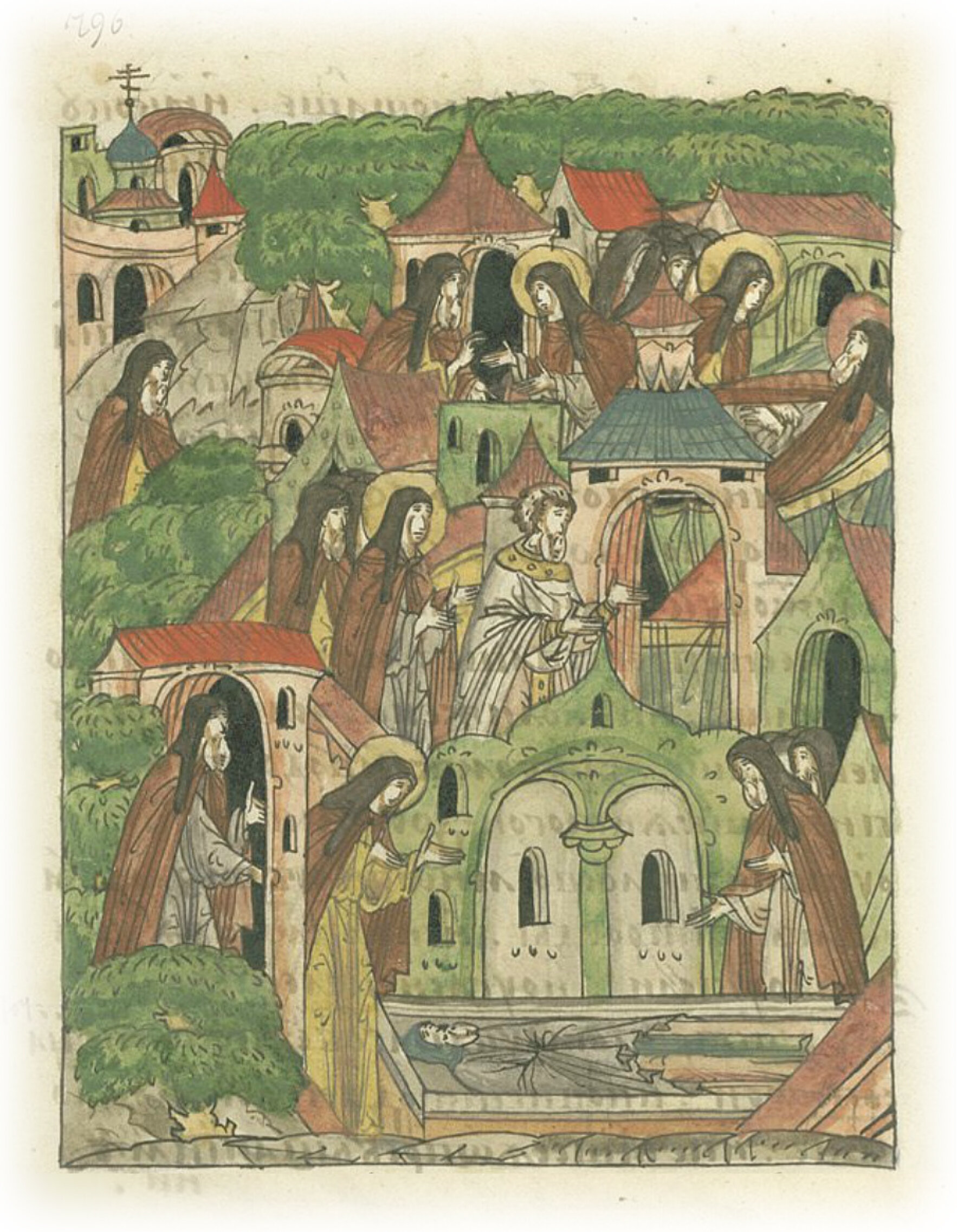 Повесть о преподобном Сергии Радонежском. Игумен Митрофан приходит к Сергию и остается у него жить, но через некоторое время заболевает и умирает.