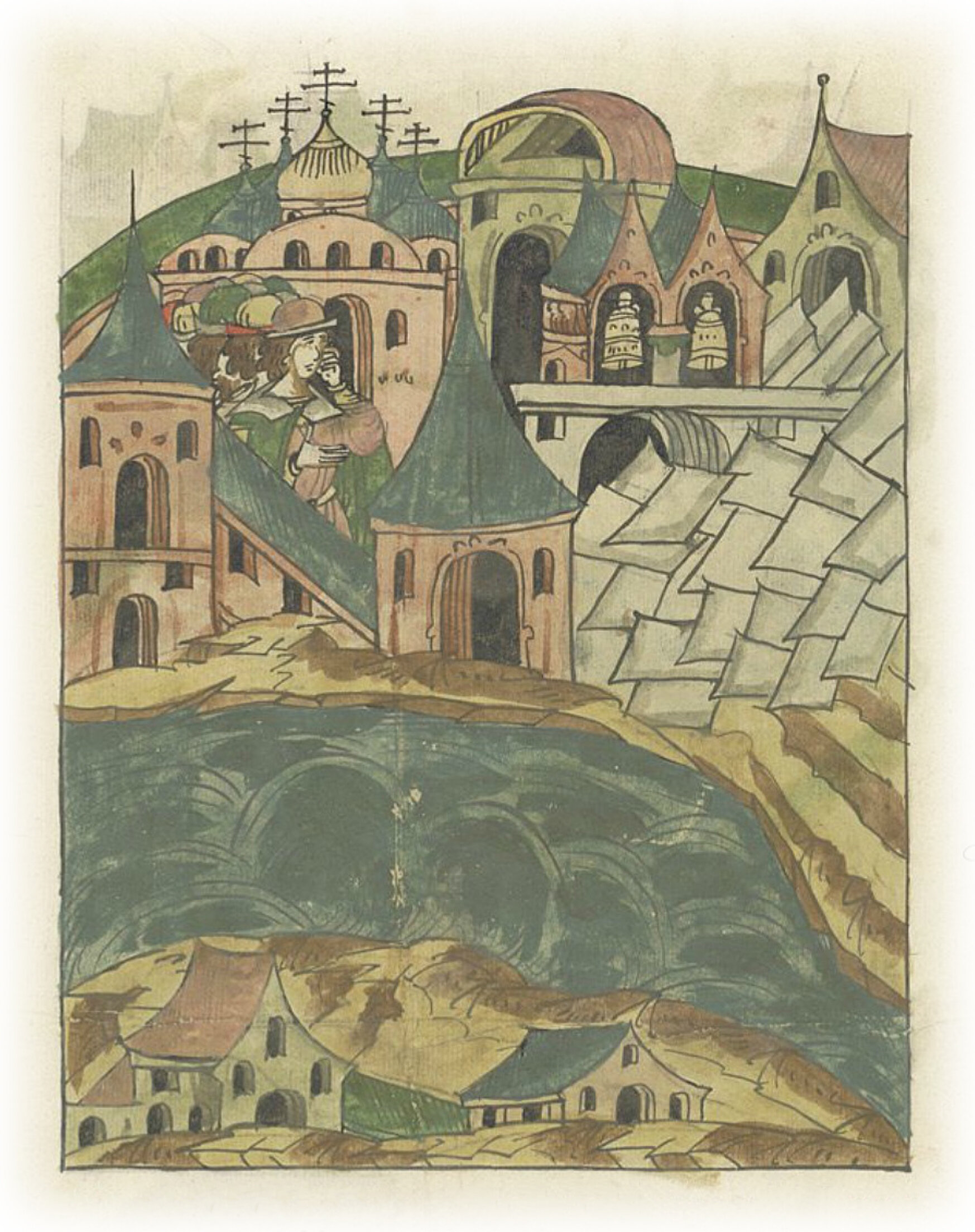 В ту же весну в Новгороде вода подмыла вал у города Детинца, и оползла земля от стен, упала каменная стена и каменная колокольня в реку Волхов.