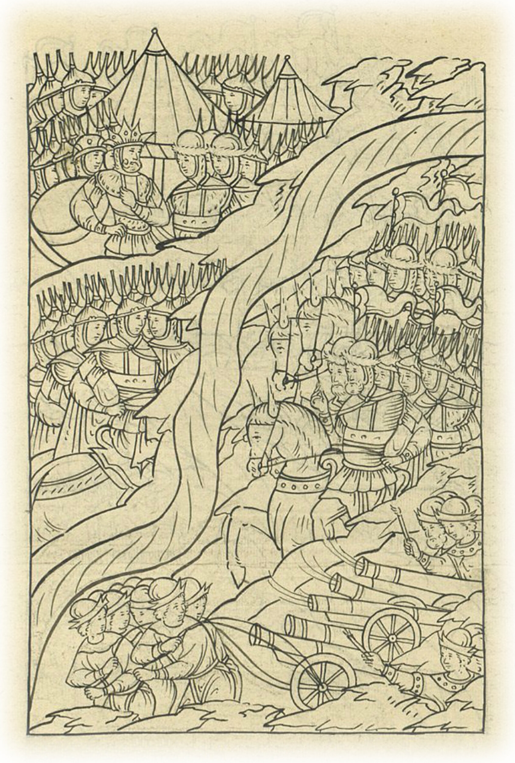 И ночью той пришел большой наряд великого князя (с пушками); и повелели воеводы пропускать пушки и пищали большие, к утру готовить. И прослышал царь, что пропускают пушки большие, а прошедшим днем их не было, и пришел великий страх на него.