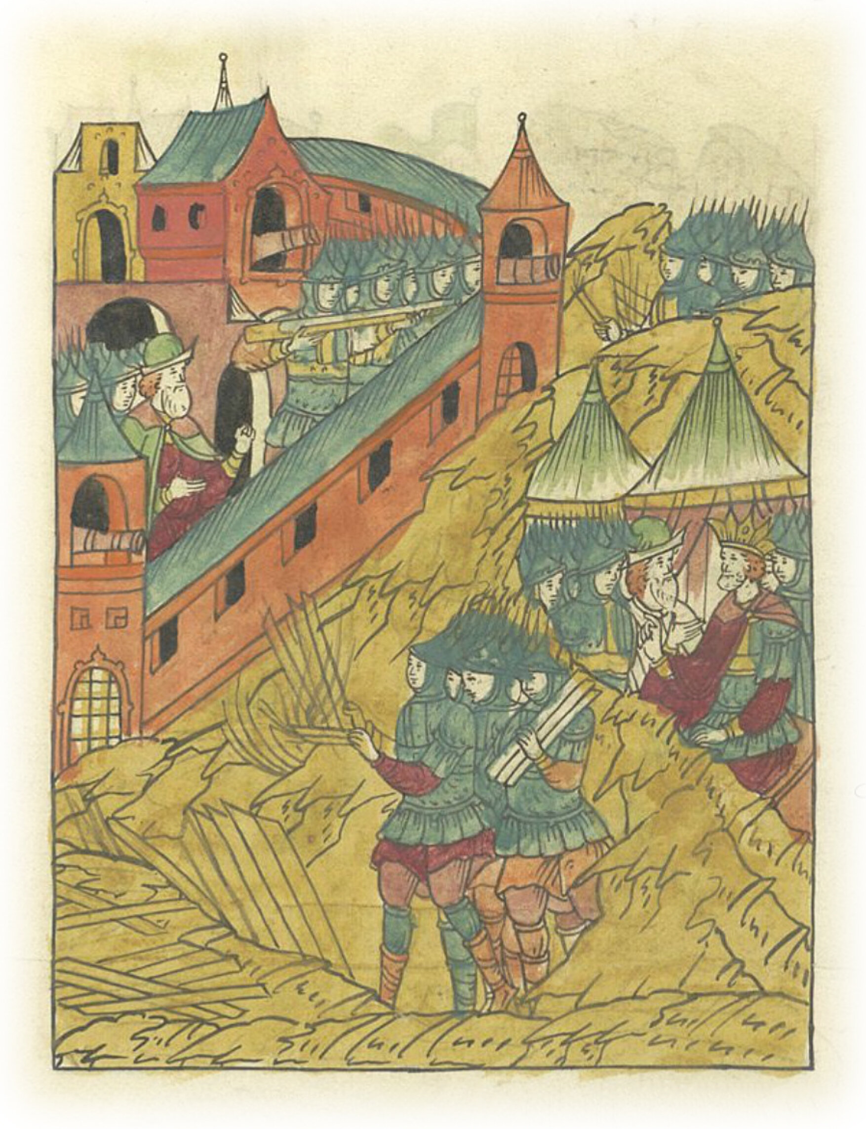 Татары же ночным временем с приметами* и с огнем многажды приходили и хотели взять город, но * то, что осаждающие набрасывали на стены города: для устройства пожара, для заваливания рвов, для облегчения подъема на стены.