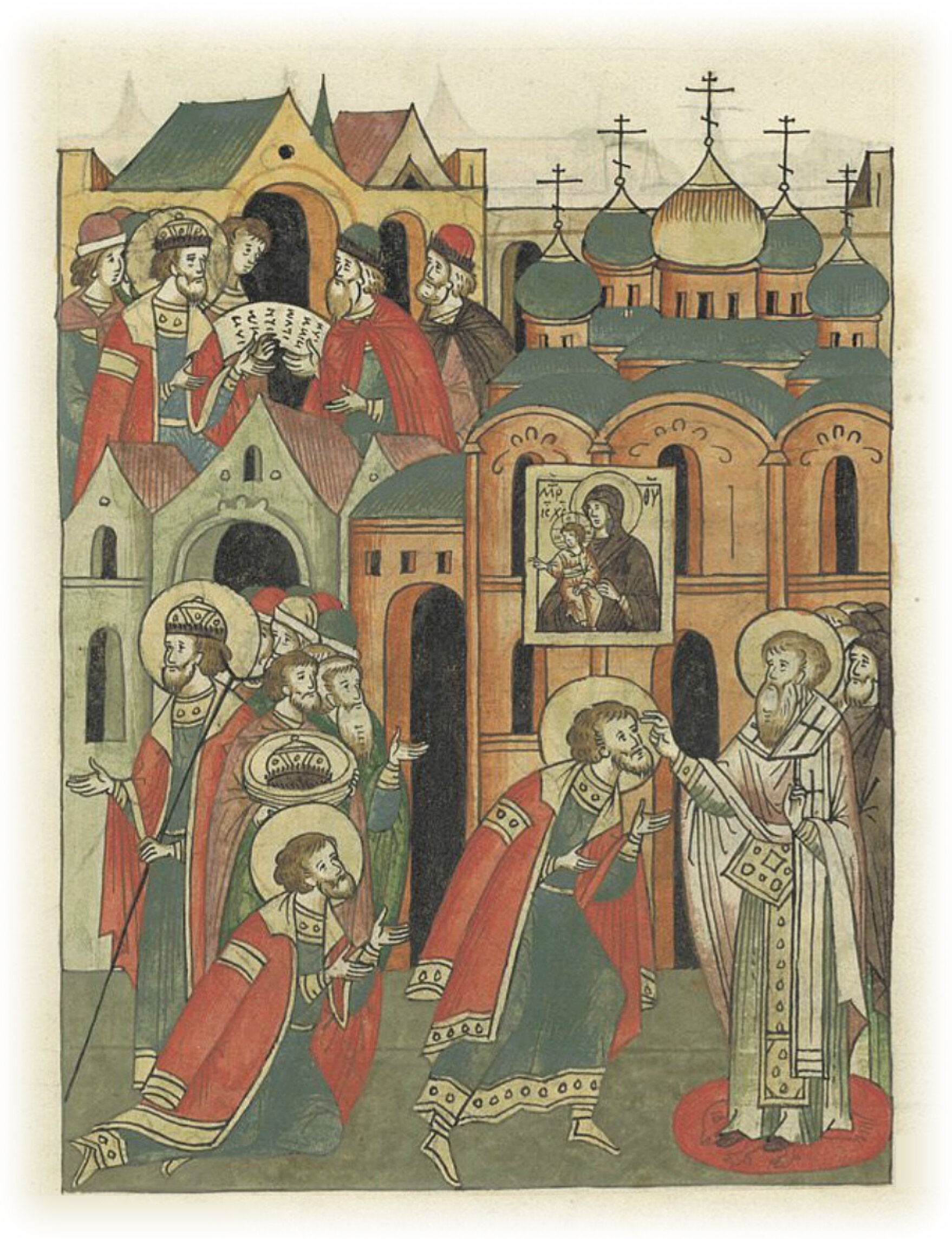 Князь Александр Ярославич, узнав о том, что шведы идут на него войной, молится в церки святой Софии и берет благословление у архиепископа Спиридона.