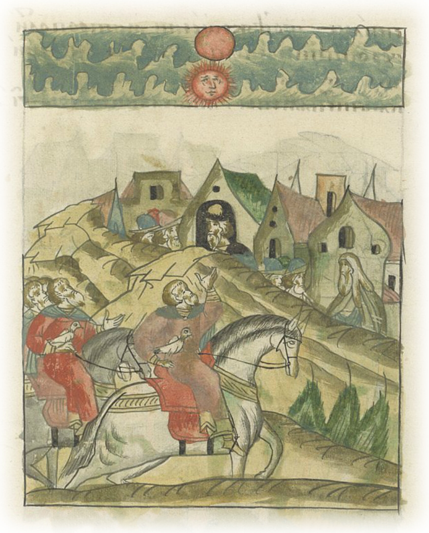 Того же месяца ноября в 9 день князя великого ловчий Григорий Перфушков видел два солнца в два часа дня, когда ездил на поле с птицами: настоящее солнце шло своим путем, а другое, необычное, выше его среди неба шло, как обычное посреди лета ходит, и светло же белостью, а лучей от него не было; видел же то не один он, но и другие, бывшие с ним. Той же осенью митрополит Геронтий поставил палату кирпичную на своем дворе на четырех подклетах каменных, а вошел в нее (месяца) ноября в 13 день.