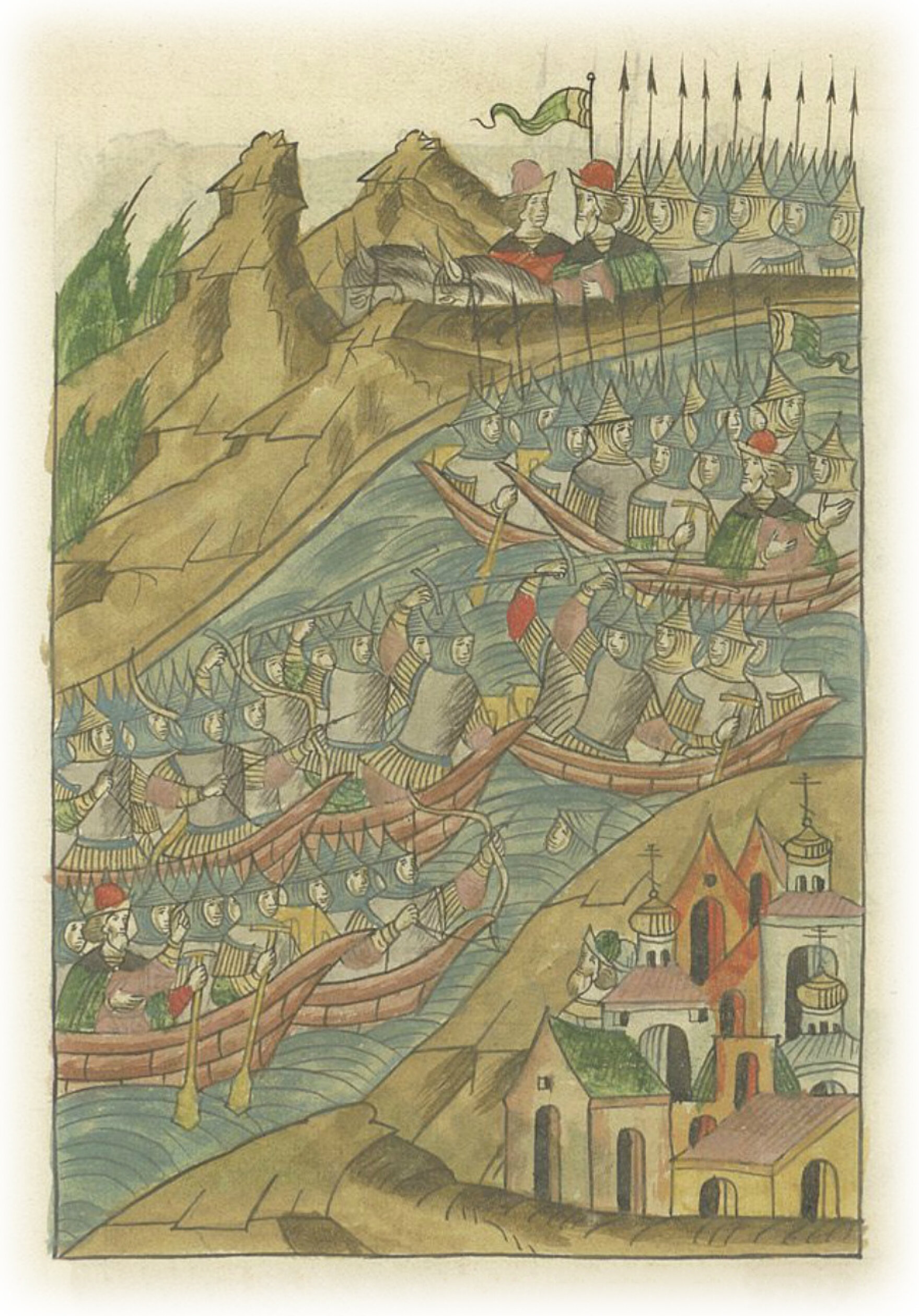 Судовая рать великого князя Ивана Васильевича побеждает татар, и они бегут к берегу, где стоит их конная рать.