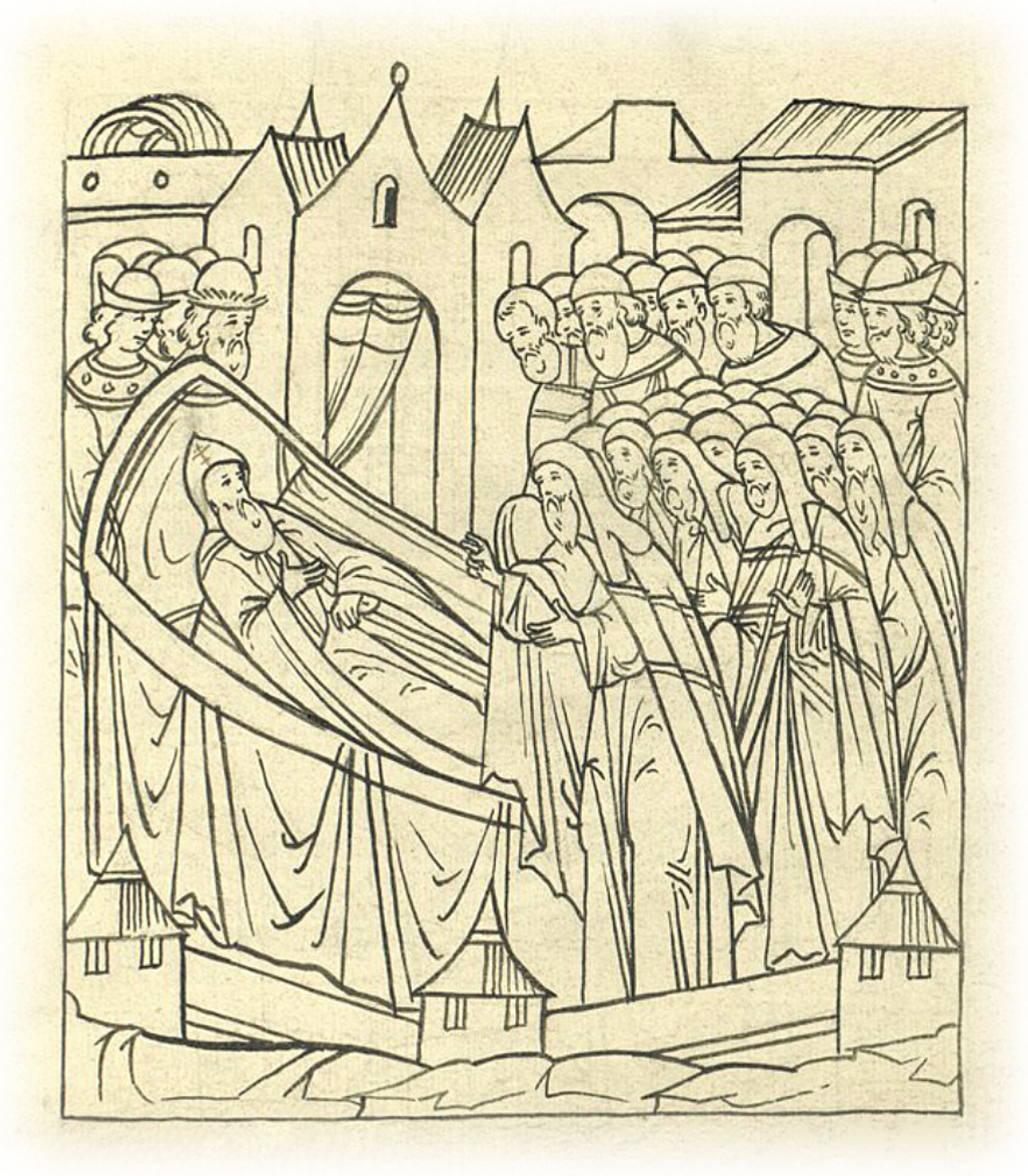 Тогда же пришел Даниил митрополит и с ним владыка Вассиан Коломенский и Досифей Крутицкий; а иные владыки были тогда в своих областях и поэтому не поспели; архимандриты же тогда были: Чудовский Иона да Симоновский Филофей, Андрониковский Зосима, игумен Троицкий, игумен Иосифовский, игумены московские все и протопопы московские все, и священники.