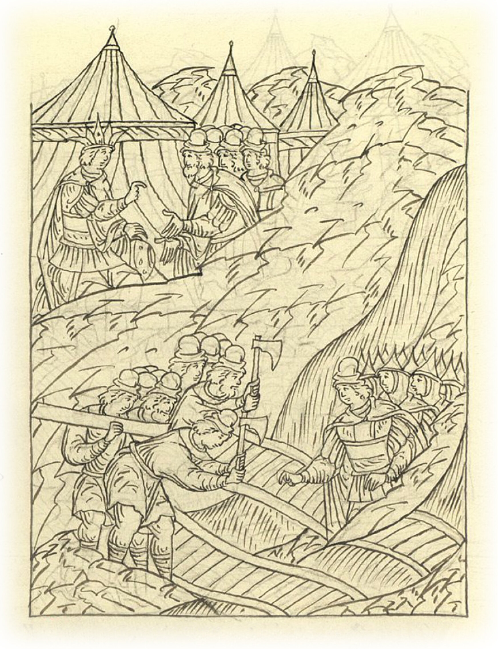 Языки говорят воеводам царя Ивана Васильевича, что магистр окопался большим рвом вокруг города Рындола, бьет из пушек и пищалей и приступает к Рындолу.