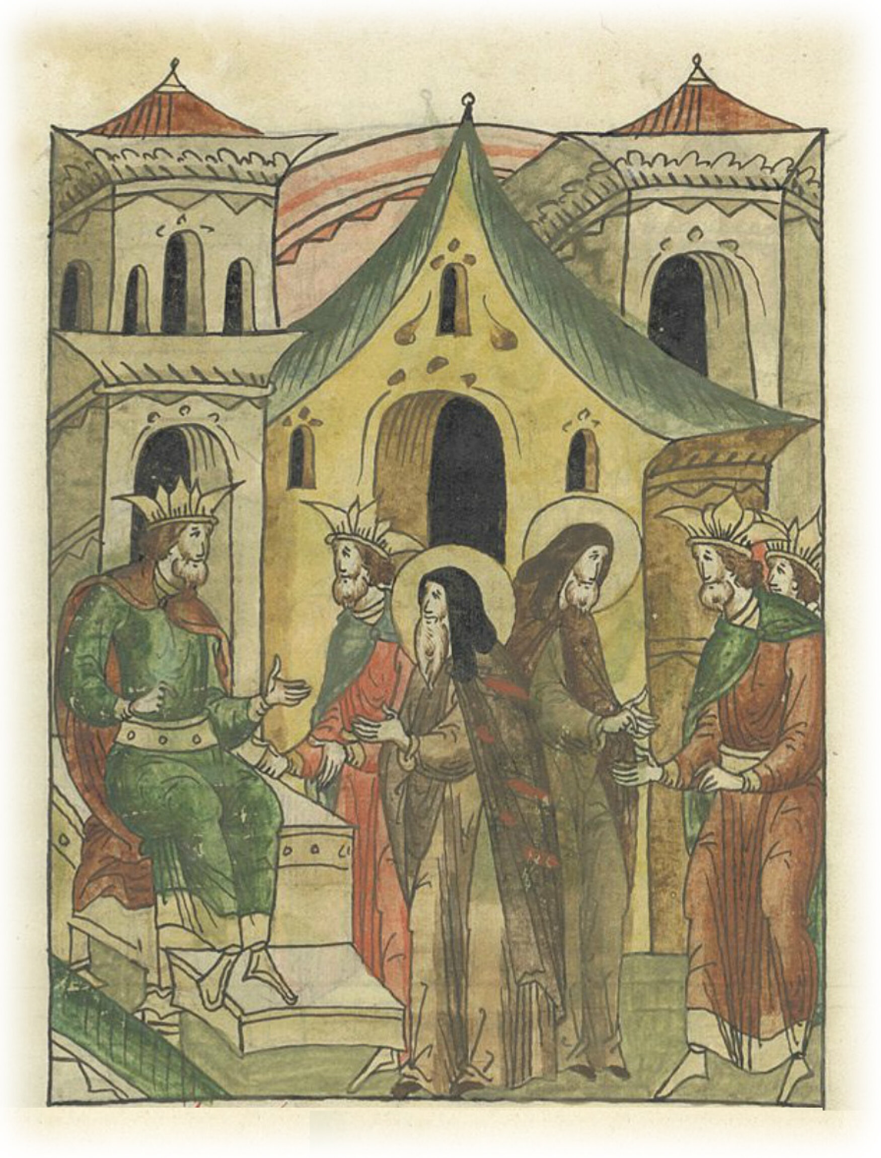 Ругодивские посадники Яким и Захар приезжают в Москву. Воеводы царя Ивана Васильевича Алексей Адашев и Иван Михайлов сообщают им, что государь пожалует их, если сдадут его воеводам помимо Ругодива Вышгород.