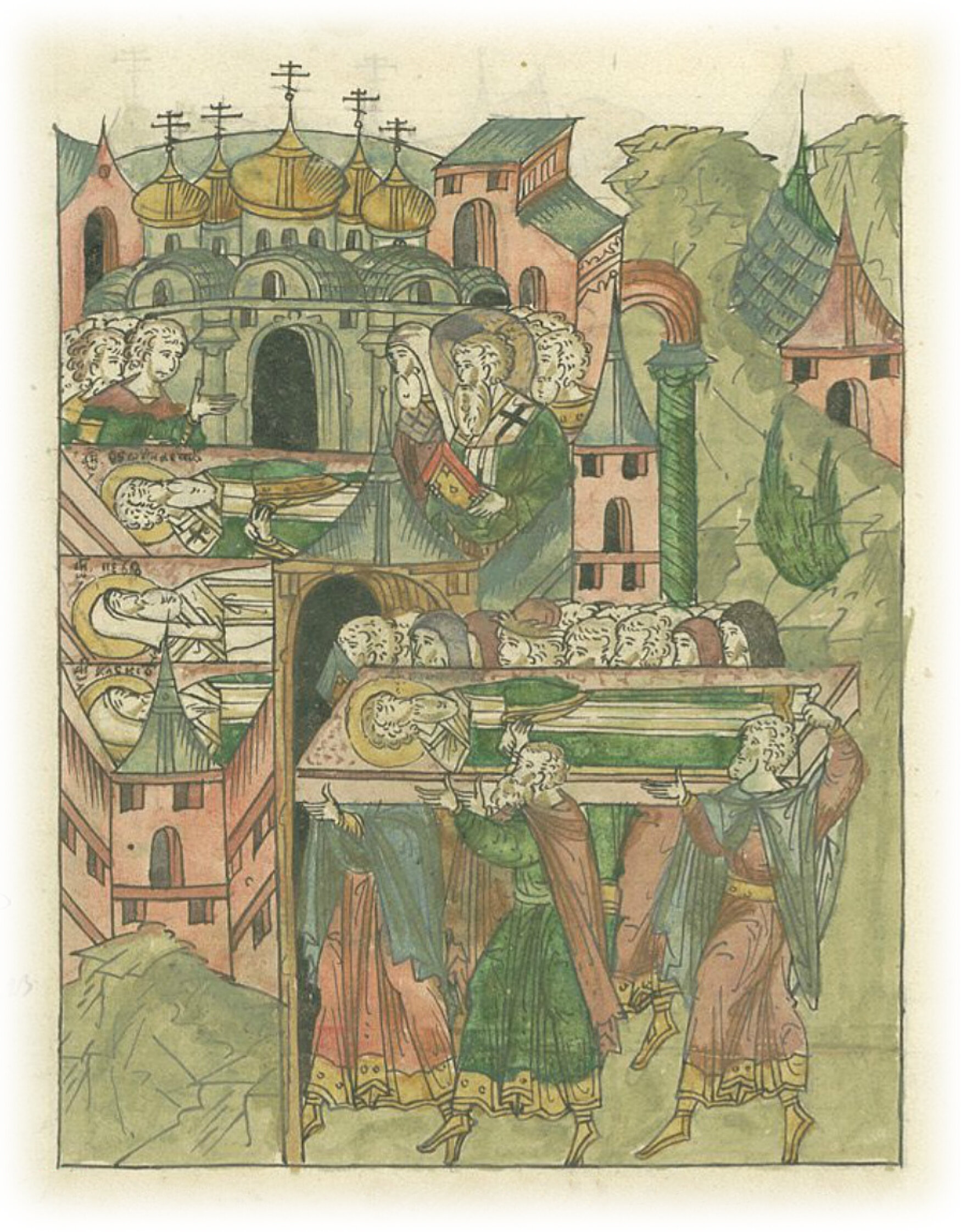 И быстро собрались князья, бояре, воеводы и множество людей, перенесли его тело в Москву в митрополичью соборную церковь Пречистой Богородицы, где находится гроб великого чудотворца митрополита Петра и блаженного митрополита Феогноста.