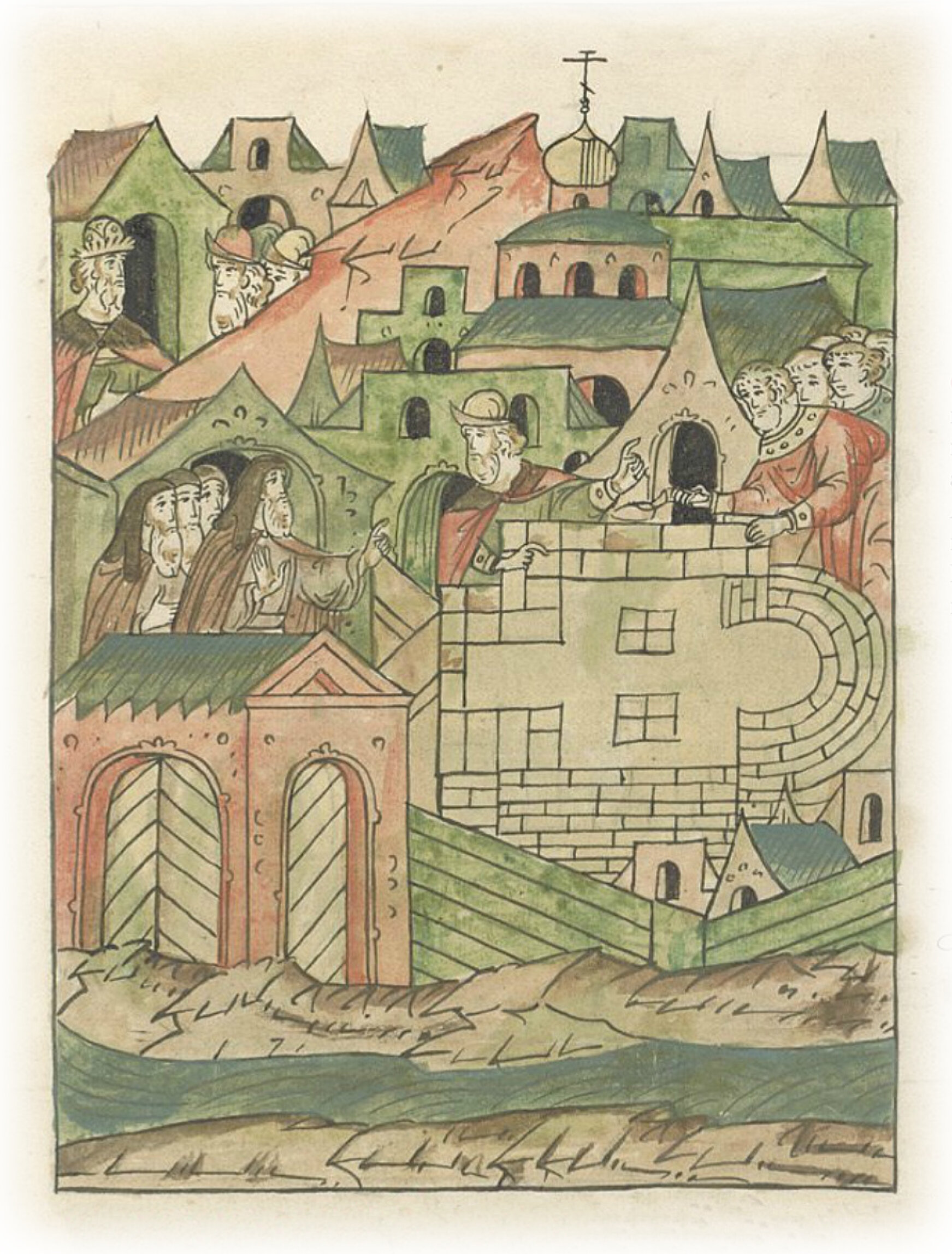 О церкви на Новом. В ту же весну повелением великого князя Ивана Васильевича архимандрит Спасский Афанасий Щедрый заложил на Новом каменную церковь Преображения Господа нашего Исуса Христа.