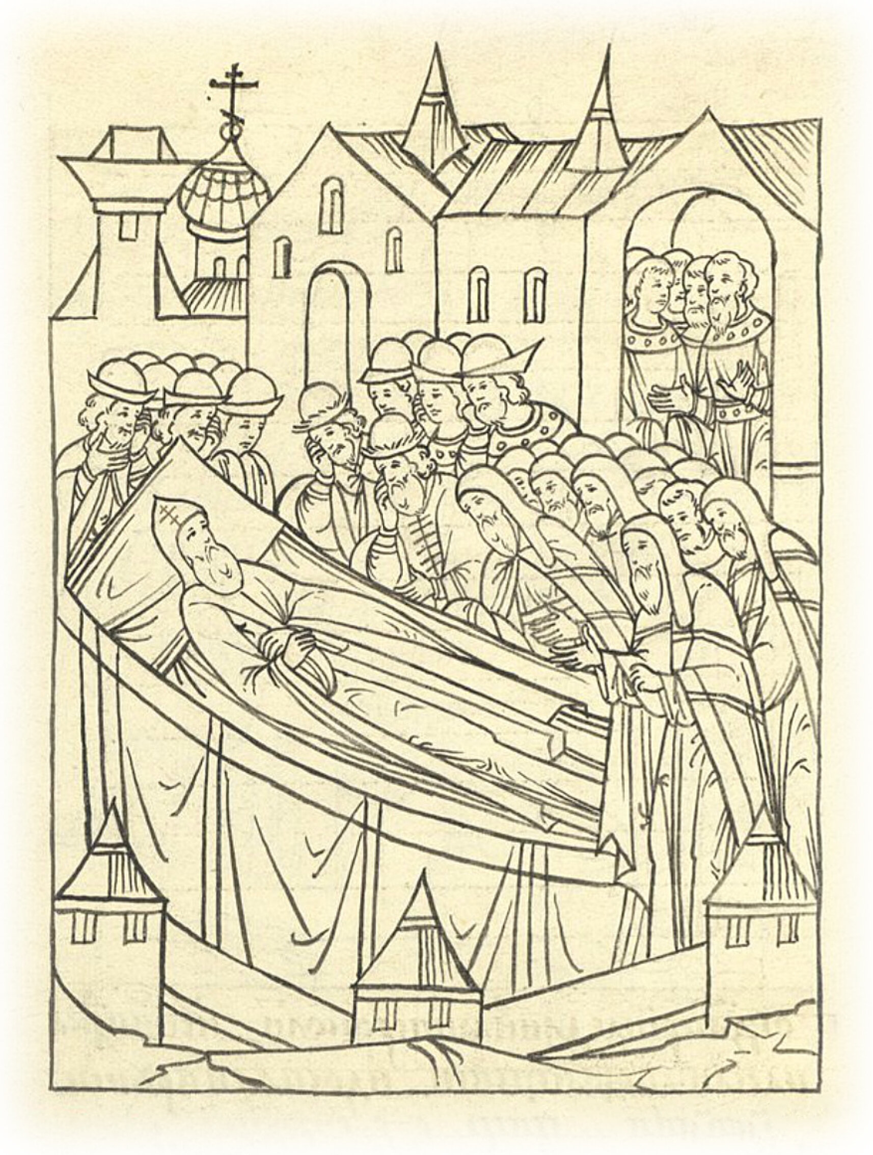 Братья великого князя, князья Юрий и Андрей Ивановичи, бояре и весь народ приходят на похороны великого князя Василия Ивановича.