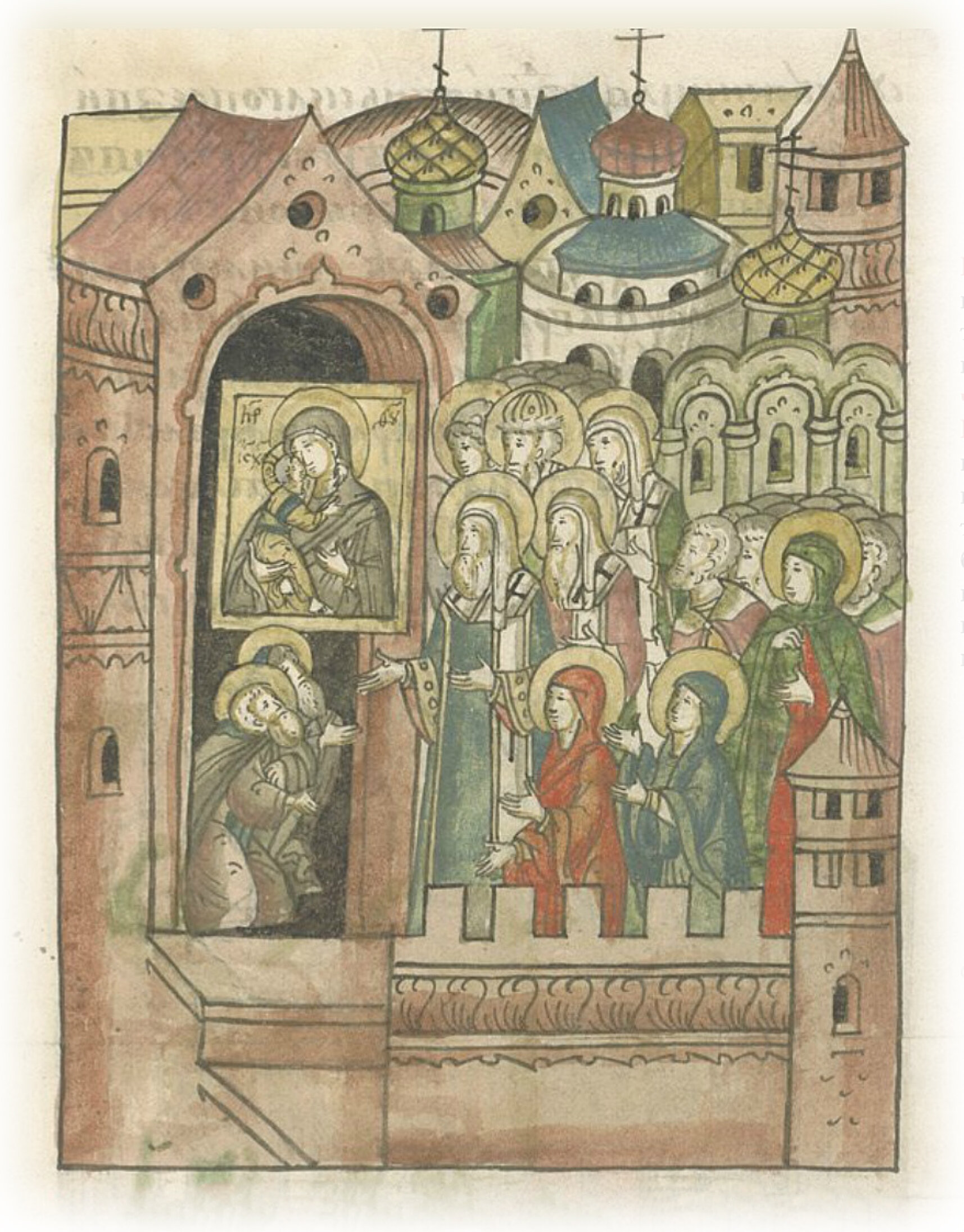 Но не только одна эта инокиня сподобилась видеть такое дивное видение, но и многие иные. То же чудо видели две вдовицы. Были некие две жены, вдовы благоговейные: одна именем Евдокия, называемая также Коломянка, супруга бывшая некоего воина костромитянина; другая именем Ульяна, которая очами мало видела, бывшая супружница воздвиженского пресвитера Евсевия, близ тех же Фроловских ворот. И эти две жены со многими иными были в осаде. Не имея своего дома в городе, они обитали под папертью у церкви святого великомученика Георгия, что у ворот Фроловских. И этим двум женам также тогда открыто было от Бога видеть то, что видела вышеназванная инокиня.