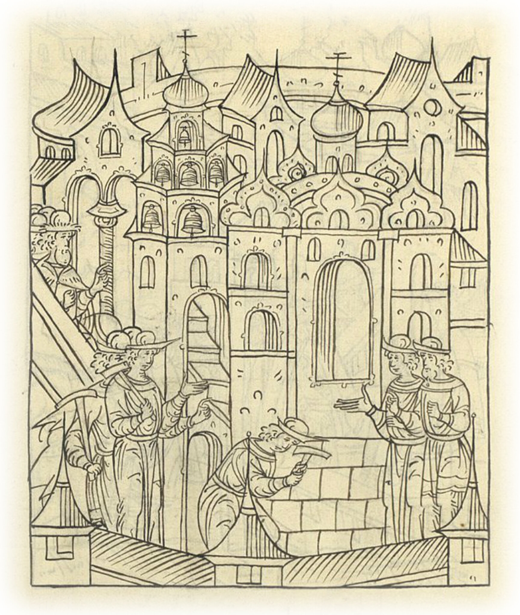 В том же месяце доделали церковь Воскресения Христова на площади возле церкви Ивана святого, которая под колоколами; а заложена была повелением великого князя Василия Ивановича всея Руси в 7040 (1532) году. А церковной мастер – Петрок Малый Фрязин; начал делать и совершил без лестницы.