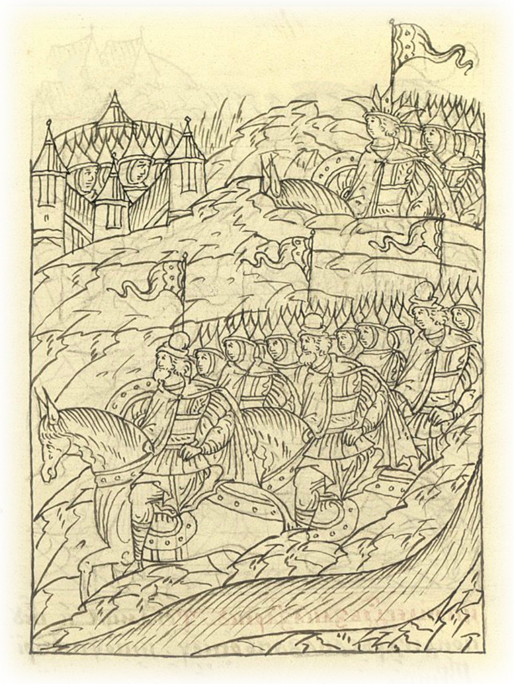Царь Иван Васильевич встает на Терень-Узяке, а полки встают на Царевом лугу вниз по Волге.