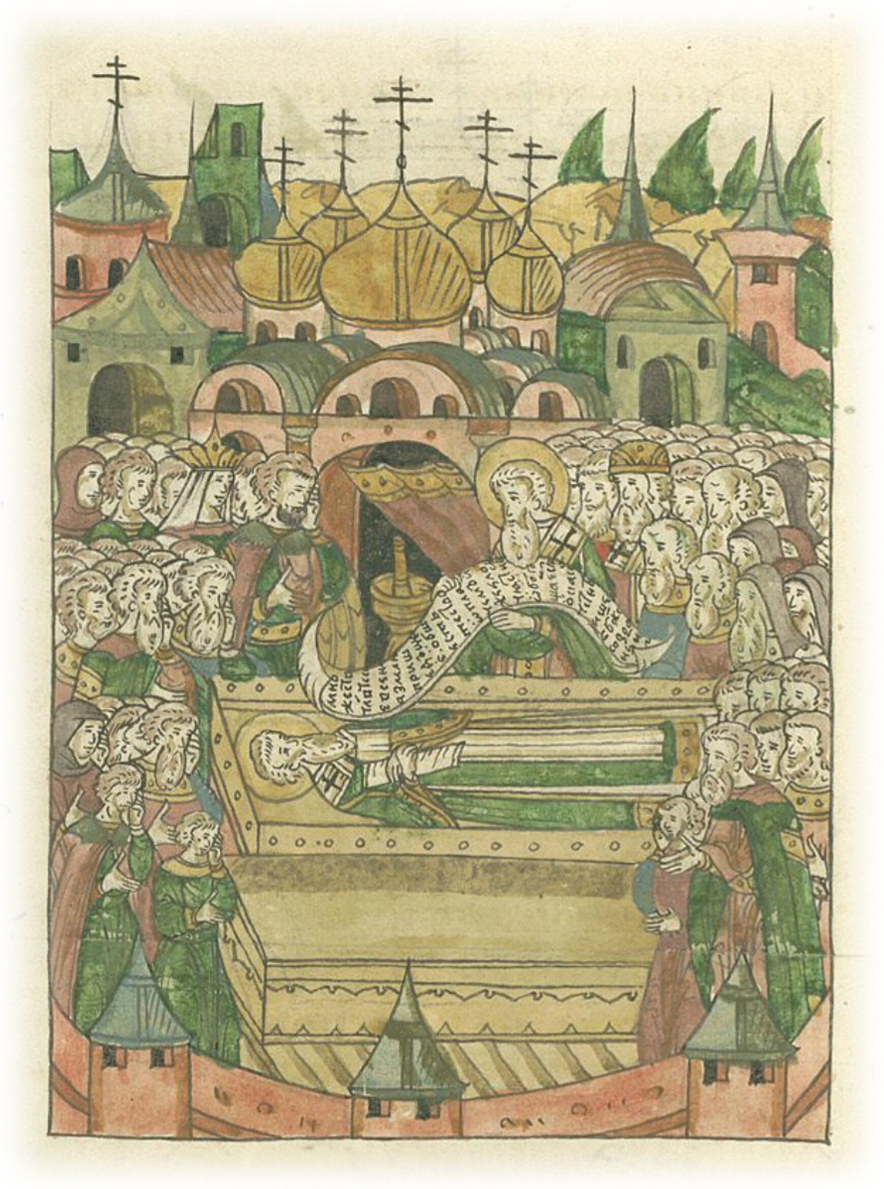 И положили его по его распоряжению в митрополичьей соборной церкви Успения Пречистой Богородицы в Москве по правой стороне у стены. Первым митрополитом в Москве был Петр чудотворец, в этой соборной церкви был он и похоронен по своему завещанию; 2. Феогност Грек, также в этой церкви был похоронен по своему завещанию; 3. Алексий чудотворец, похоронен был в созданном им самим монастыре святого чуда архистратига Михаила в Москве. Четвертый – митрополит Киприан, родом серб, человек, исполненный любомудрия и божественного разума, грамотный и духовный, известный добродетельной жизнью, обучавший всех церковному учению и наукам; много было в нем старания и способностей непрестанно учить всех слову Божью, а не праздно рассуждать о суетных вещах и беседовать с нечестивыми людьми. Прожил он добродетельную жизнь до самой старости и сильно разболелся в митрополичьем селе в Голянище, тихо и безмятежно проводя свою жизнь, где была расположена его домовая церковь во имя святых Трех Святителей, где он сам любил часто бывать и жить, так как то место было тихое, безмолвное, свободное от всяческой суеты, расположено оно было между двух рек Сетуни и Раменки на стрелице* и над прудом, и вокруг было много леса. И митрополит Киприан сам часто любил пребывать там и жить, переписывал сам книги, поставлял там в епископов, упражнялся в молитве и чтении Божественных Писаний, проводил время в памяти смертной и Страшного Суда, бесконечных мучений, там же он и разболелся, пролежал несколько дней, пока не преставился. За четыре дня до своей смерти он написал прощальную грамоту, в которой всех прощал и благословлял, сам просил у всех прощения и благословения, вот истинное любомудрие и смирение. Поэтому и заповедал, так как смирением все согрешения прощаются и все благое происходит, и, покидая этот мир, заповедал епископам и всем своим ближним, говоря: «Когда меня в гроб положат, прочитайте эту грамоту людям вслух над моим телом», что и было сделано согласно его распоряжению преподобным Григорием, архиепископом Ростовским, который прочитал эту грамоту громко вслух всему народу, и когда читал ее, то у многих находящихся там навернулись слезы на глаза, раздавался громкий плач и рыдание. Было в этой грамоте написано: «Во имя Святой и Живоначальной Троицы. Я, грешный и смиренный Киприан, митрополит Киевский и всея Руси, увидев, что настала моя старость, что стал я часто болеть, очищая болезнью по человеколюбию Божью свои грехи, что умножились теперь, как никогда прежде, мои болезни, и что все это возвещает мне ни что иное, как смерть и Страшный Суд Спасителя, решил, что должен в своем завещании сказать о насущном для меня. Первое – исповедую святую, полученную от Бога, апостольскую веру и истинную православную веру в Святую Троицу и прочие священные апостольские заветы. Заповедую всем соблюдать предания святой Божьей церкви цело и без изменений Божьей благодатью, что в моим исповедании написано, то и предаю вам. Когда святитель рукополагается по обычаю, апостольскому уставу, божественным и священным заповедям святых отцов, так как апостолы были поставлены самим Богом, а святители – апостолами, поэтому являются они наследниками апостолов, а от тех святителей другие святители поставлялись по от Бога полученному апостольскому уставу, так и меня, грешного, поставил благода