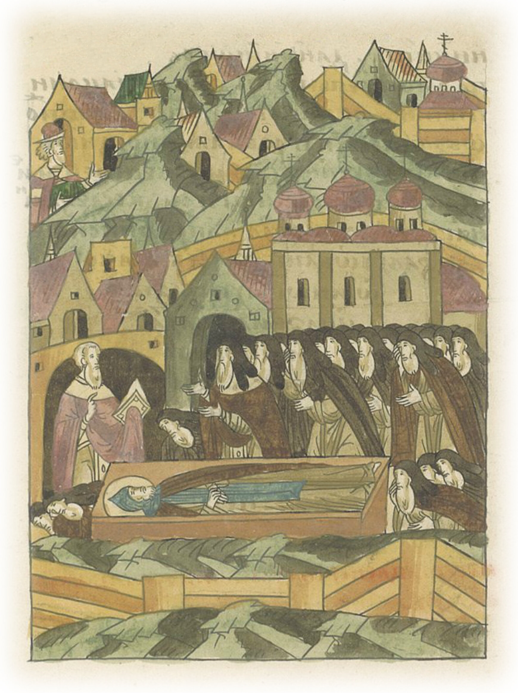 Наутро же в пятницу, в 1 час дня, был погребен; а не было никого ни из города, ни из округи на погребении его, только монастыря того священники и ученики его, старцы, его постриженики; один тогда оказался мирской священник, духовник князя Андрея Меньшого, Никита именем. Тот же Никита, да и иные из братии, ученики Пафнутия, поведали, что ни петь, ни читать каноны надгробные никого не нашлось, но только один из учеников его, Иннокентий именем, тот со многими же слезами надгробное прочел; а прочие все слезами обливались, так что многие слезы их на землю падали и проливались. Братии же тогда было 85 (человек).
